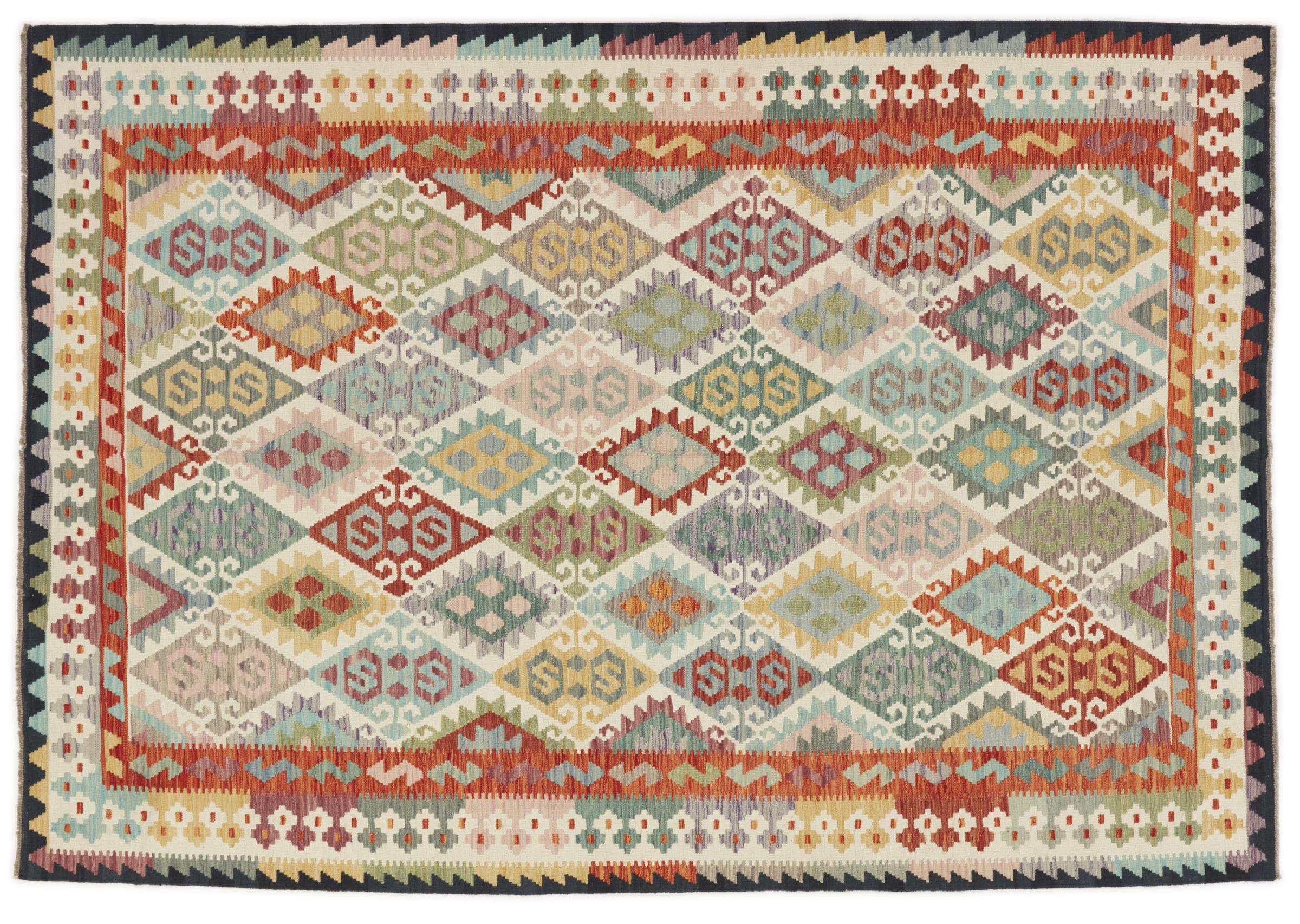 This Kilim Afghan rug has beautiful colors. It is handmade from fine wool. These patterns are traditional design elements that have already been used centuries ago. This particular kilim has been woven by hand in Afghanistan, a country with a long history in weaving and knotting rugs. The rug is robust and can be laid out on both sides.
