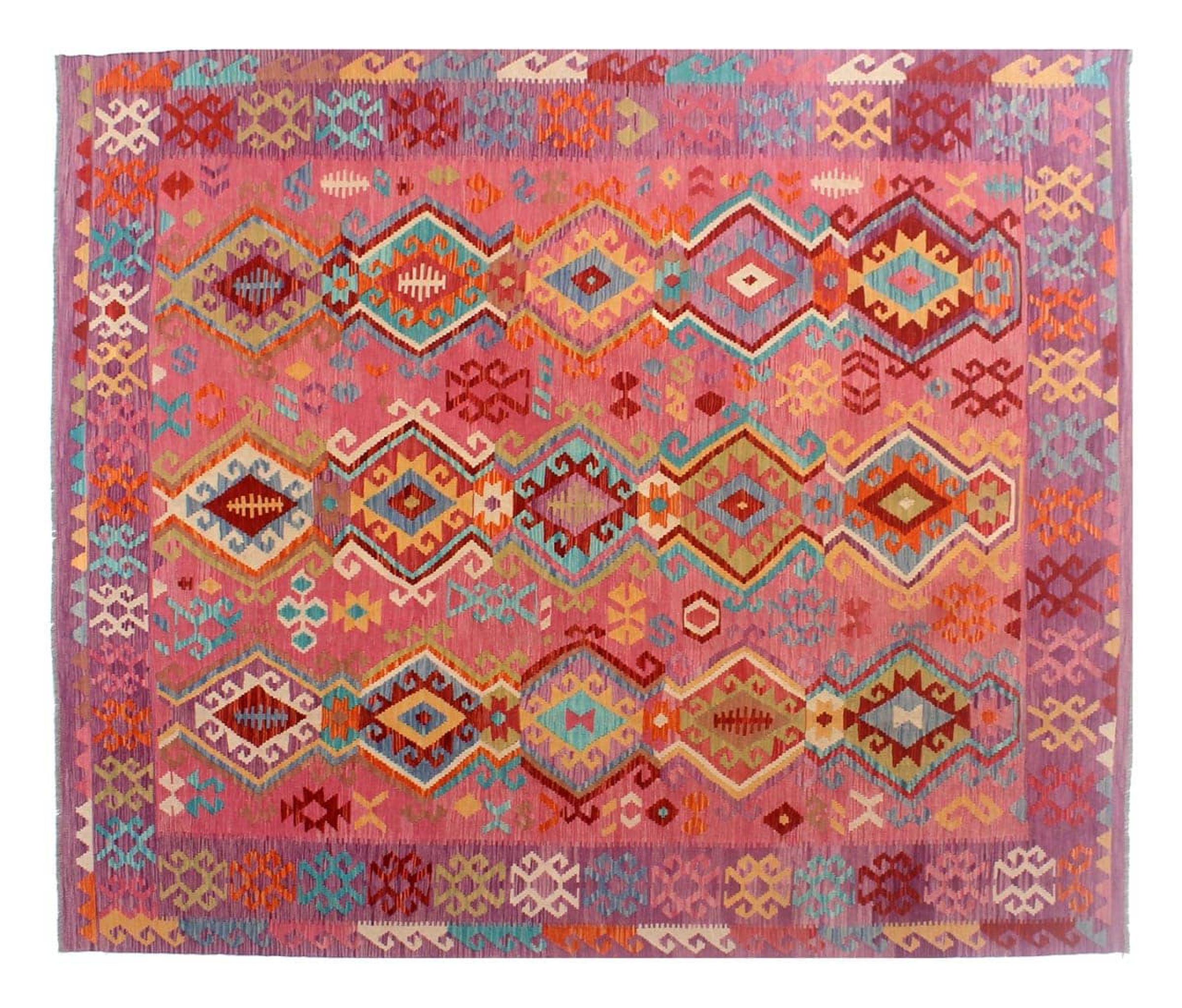 These Kilim rugs have a significant difference from hand-knotted rugs—they are handwoven. As a result, they do not have a high pile of wool and are often flatter and rougher than knotted wool rugs. Their construction is less intricate, making them generally much more affordable. Additionally, Kilim rugs are much lighter and can be laid out on either side. Handwoven Kilims originally come from what was once Persia and are now also widely produced in Afghanistan. They typically feature simple, straight-line patterns, which are characteristic of their weaving technique.