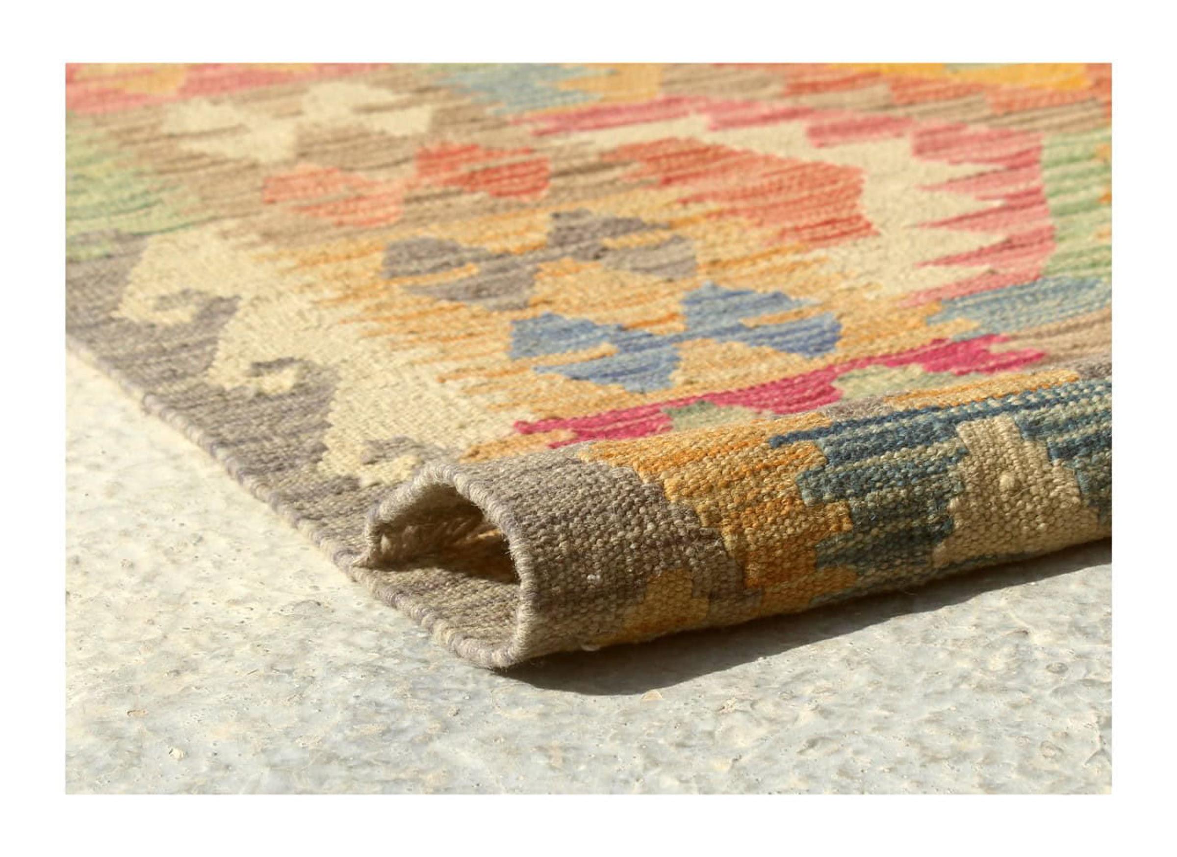 These Kilim rugs have a significant difference from hand-knotted rugs—they are handwoven. As a result, they do not have a high pile of wool and are often flatter and rougher than knotted wool rugs. Their construction is less intricate, making them generally much more affordable. Additionally, Kilim rugs are much lighter and can be laid out on either side. Handwoven Kilims originally come from what was once Persia and are now also widely produced in Afghanistan. They typically feature simple, straight-line patterns, which are characteristic of their weaving technique.