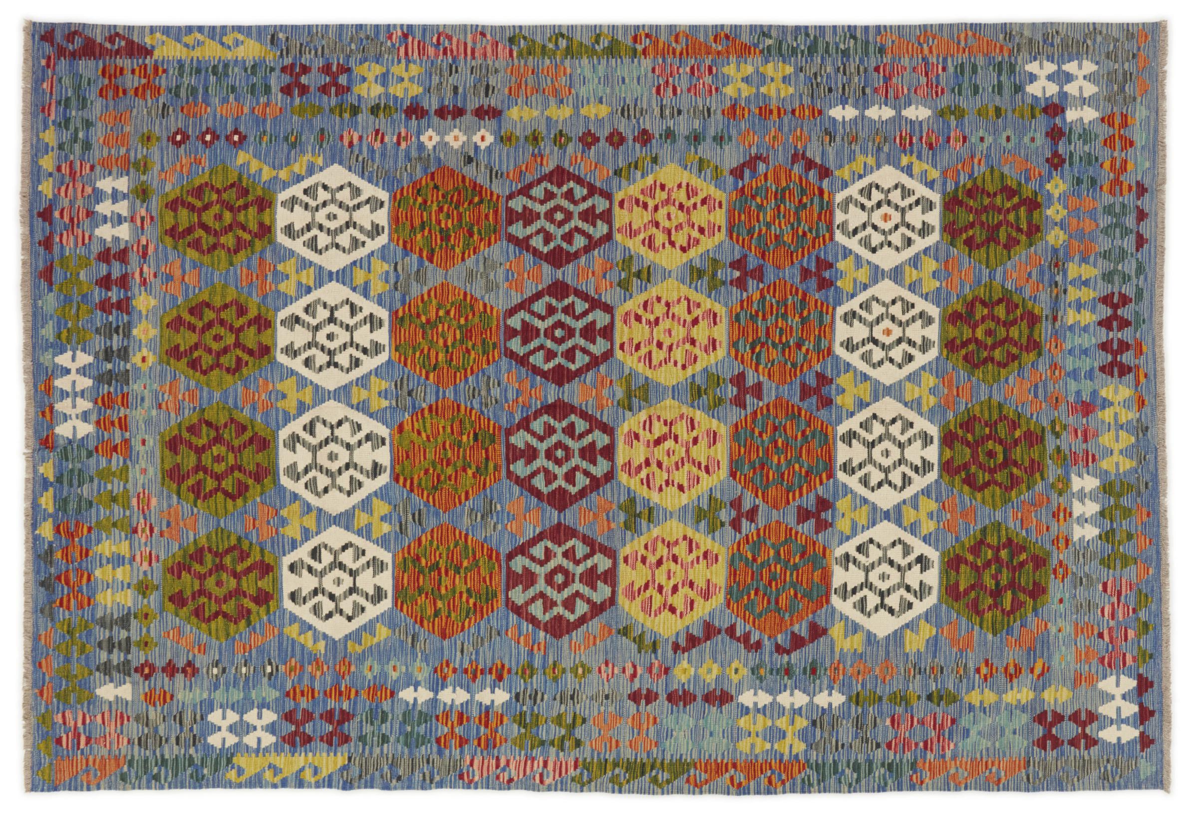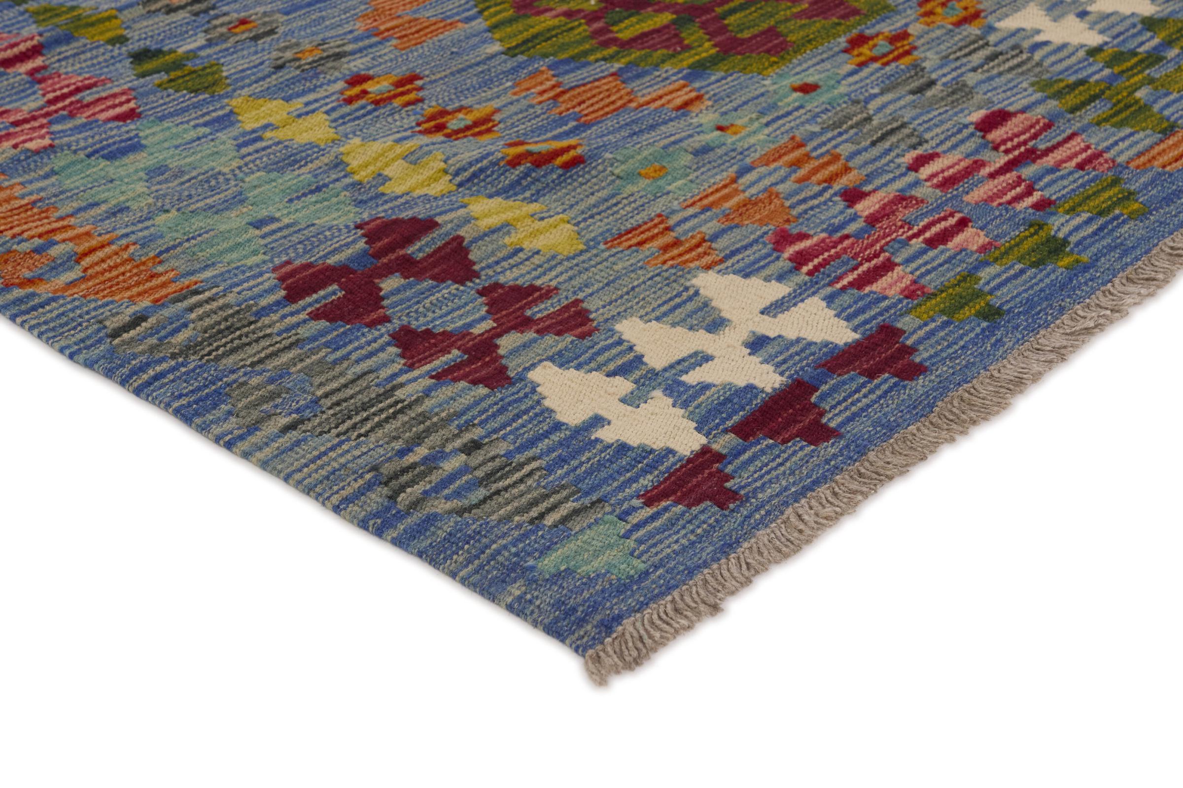 This Kilim Afghan rug has beautiful colors. It is handmade from fine wool. These patterns are traditional design elements that have already been used centuries ago. This particular kilim has been woven by hand in Afghanistan, a country with a long history in weaving and knotting rugs. The rug is robust and can be laid out on both sides.