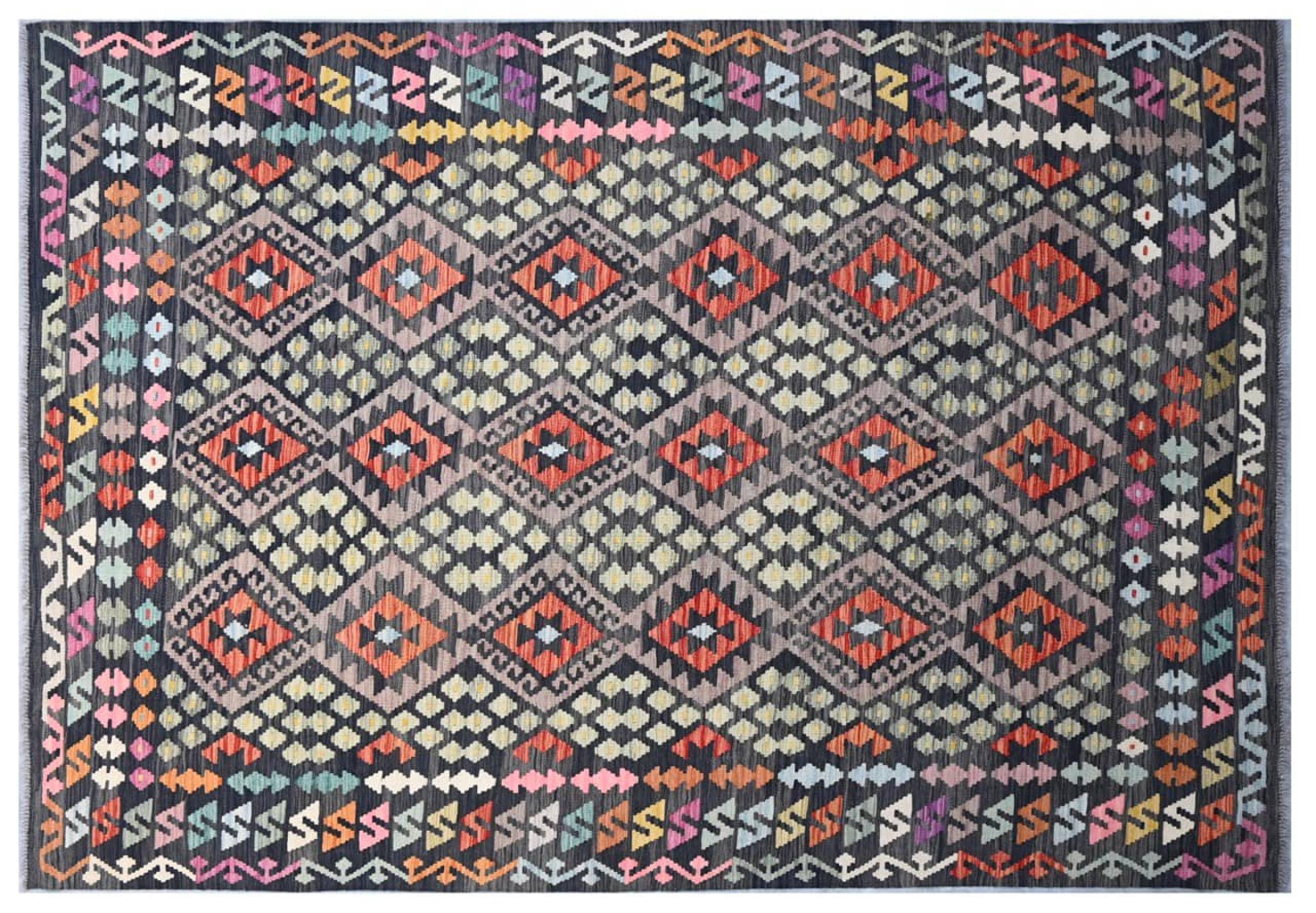 This Kilim Afghan rug has beautiful colors. It is handmade from fine wool. These patterns are traditional design elements that have already been used centuries ago. This particular kilim has been woven by hand in Afghanistan, a country with a long history in weaving and knotting rugs. The rug is robust and can be laid out on both sides.