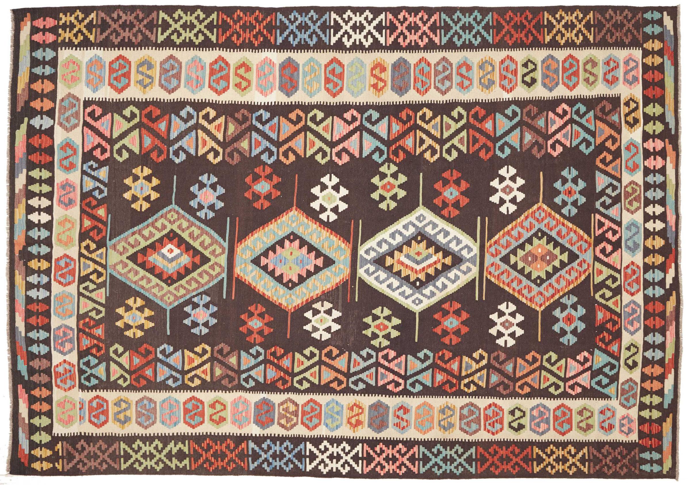 These Kilim rugs have a significant difference from hand-knotted rugs—they are handwoven. As a result, they do not have a high pile of wool and are often flatter and rougher than knotted wool rugs. Their construction is less intricate, making them generally much more affordable. Additionally, Kilim rugs are much lighter and can be laid out on either side. Handwoven Kilims originally come from what was once Persia and are now also widely produced in Afghanistan. They typically feature simple, straight-line patterns, which are characteristic of their weaving technique.