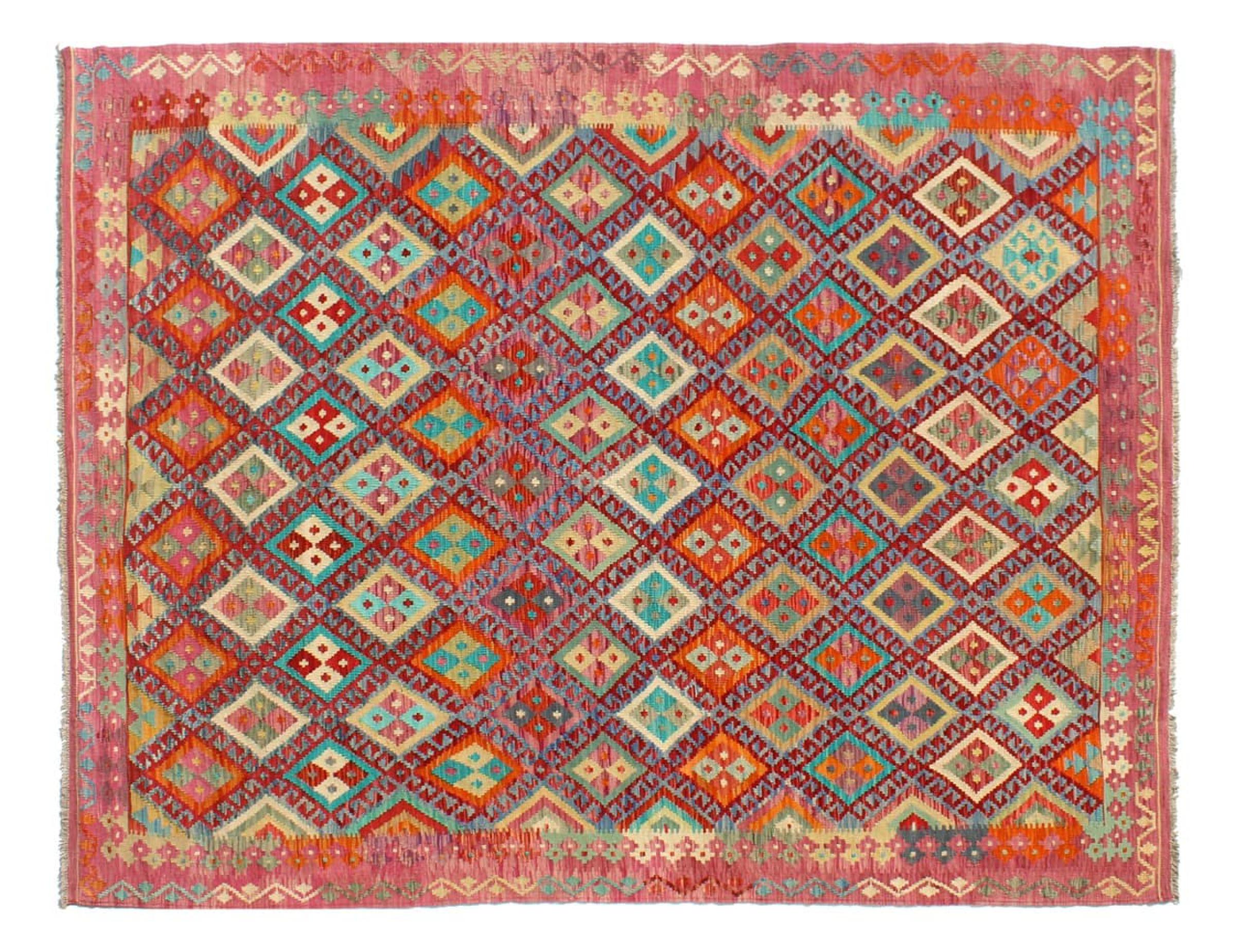 This Kilim Afghan rug has beautiful colors. It is handmade from fine wool. These patterns are traditional design elements that have already been used centuries ago. This particular kilim has been woven by hand in Afghanistan, a country with a long history in weaving and knotting rugs. The rug is robust and can be laid out on both sides.