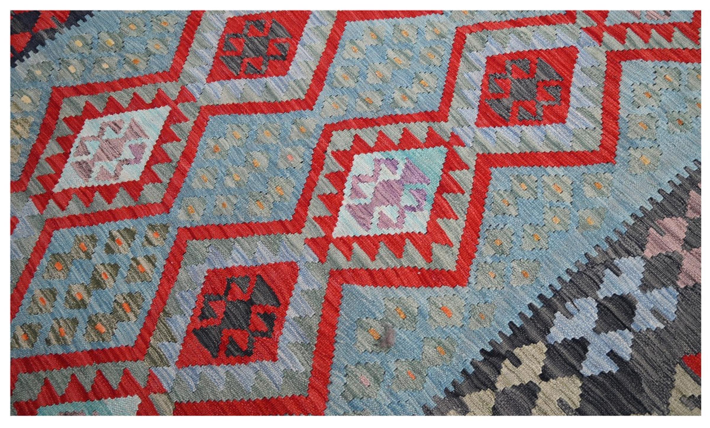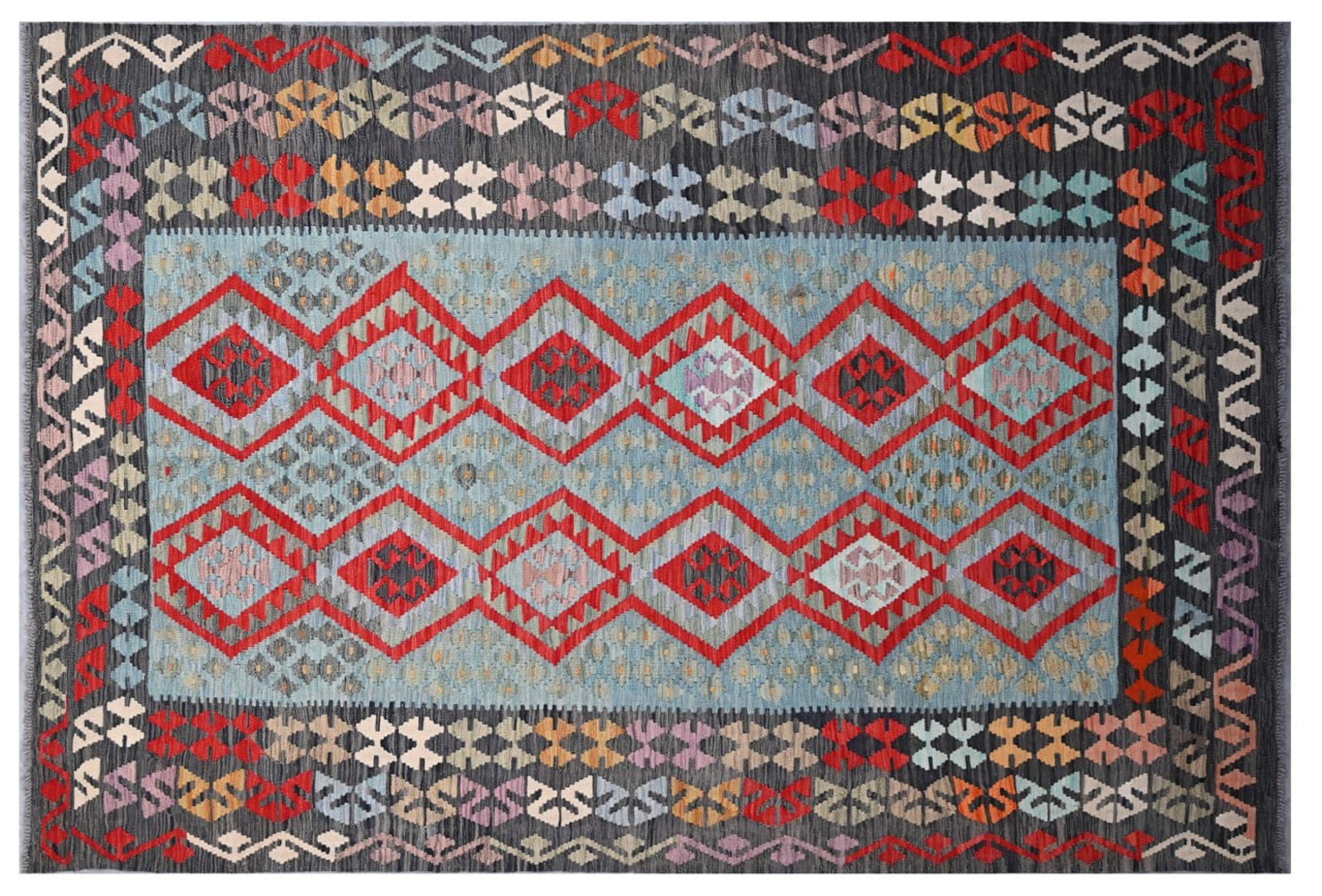 This Kilim Afghan rug has beautiful colors. It is handmade from fine wool. These patterns are traditional design elements that have already been used centuries ago. This particular kilim has been woven by hand in Afghanistan, a country with a long history in weaving and knotting rugs. The rug is robust and can be laid out on both sides.