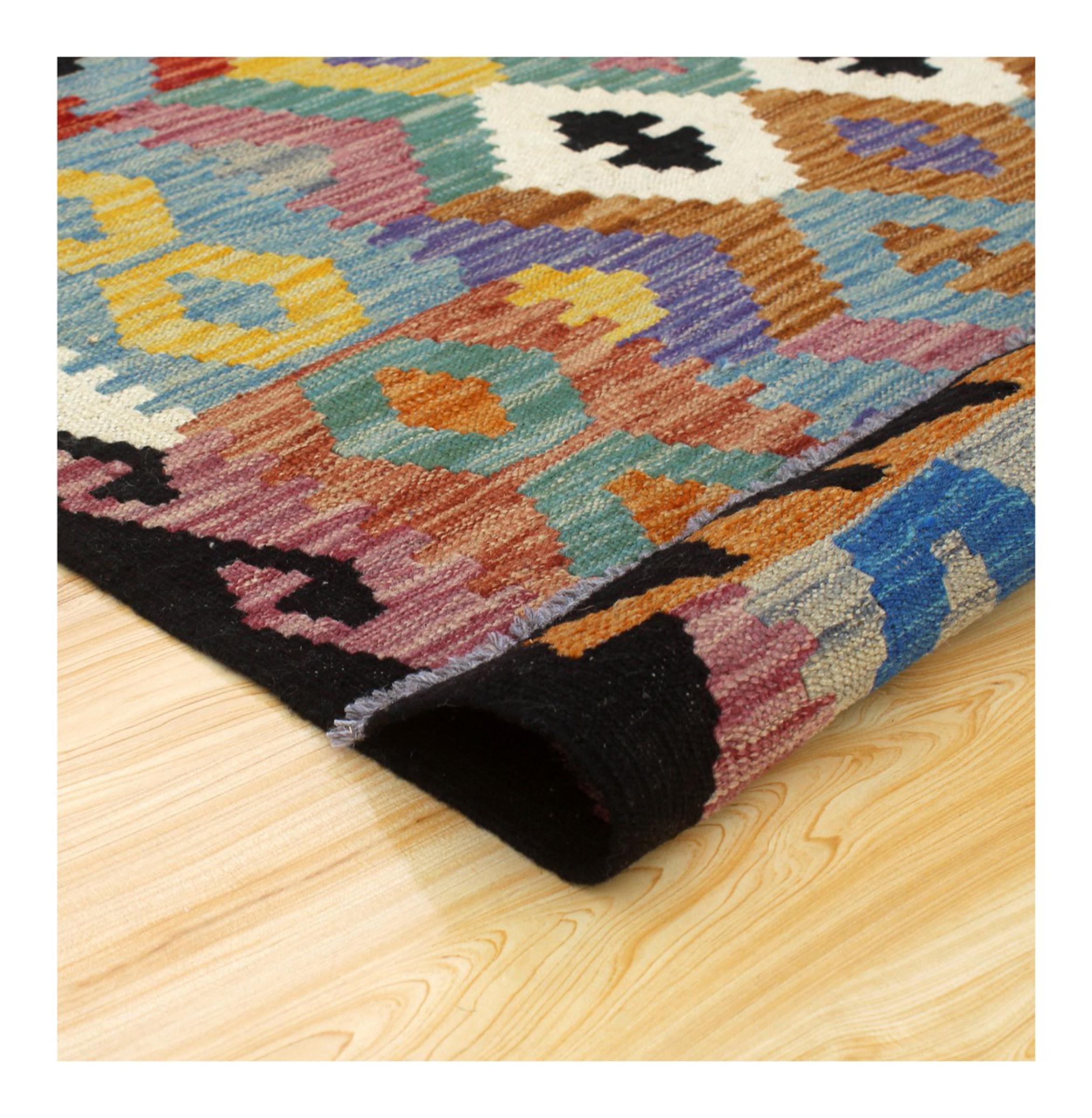 These Kilim rugs have a significant difference from hand-knotted rugs—they are handwoven. As a result, they do not have a high pile of wool and are often flatter and rougher than knotted wool rugs. Their construction is less intricate, making them generally much more affordable. Additionally, Kilim rugs are much lighter and can be laid out on either side. Handwoven Kilims originally come from what was once Persia and are now also widely produced in Afghanistan. They typically feature simple, straight-line patterns, which are characteristic of their weaving technique.