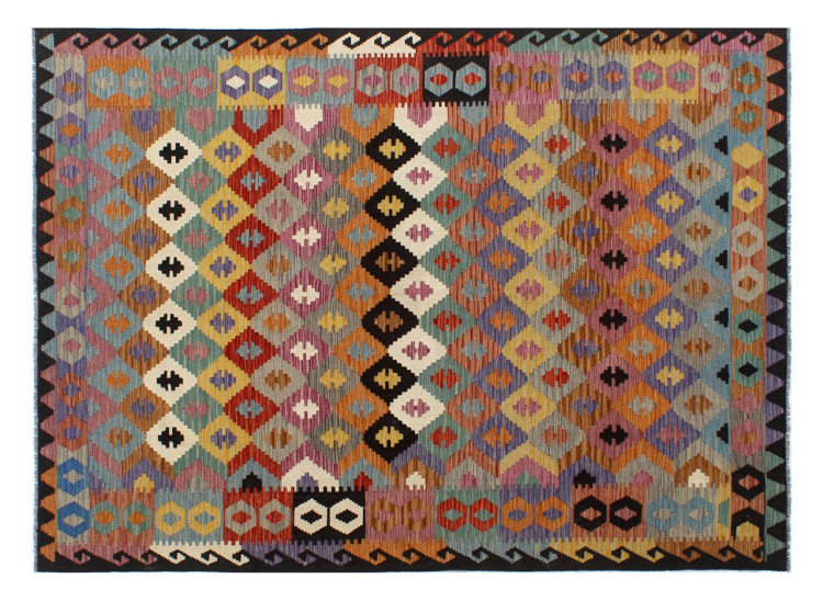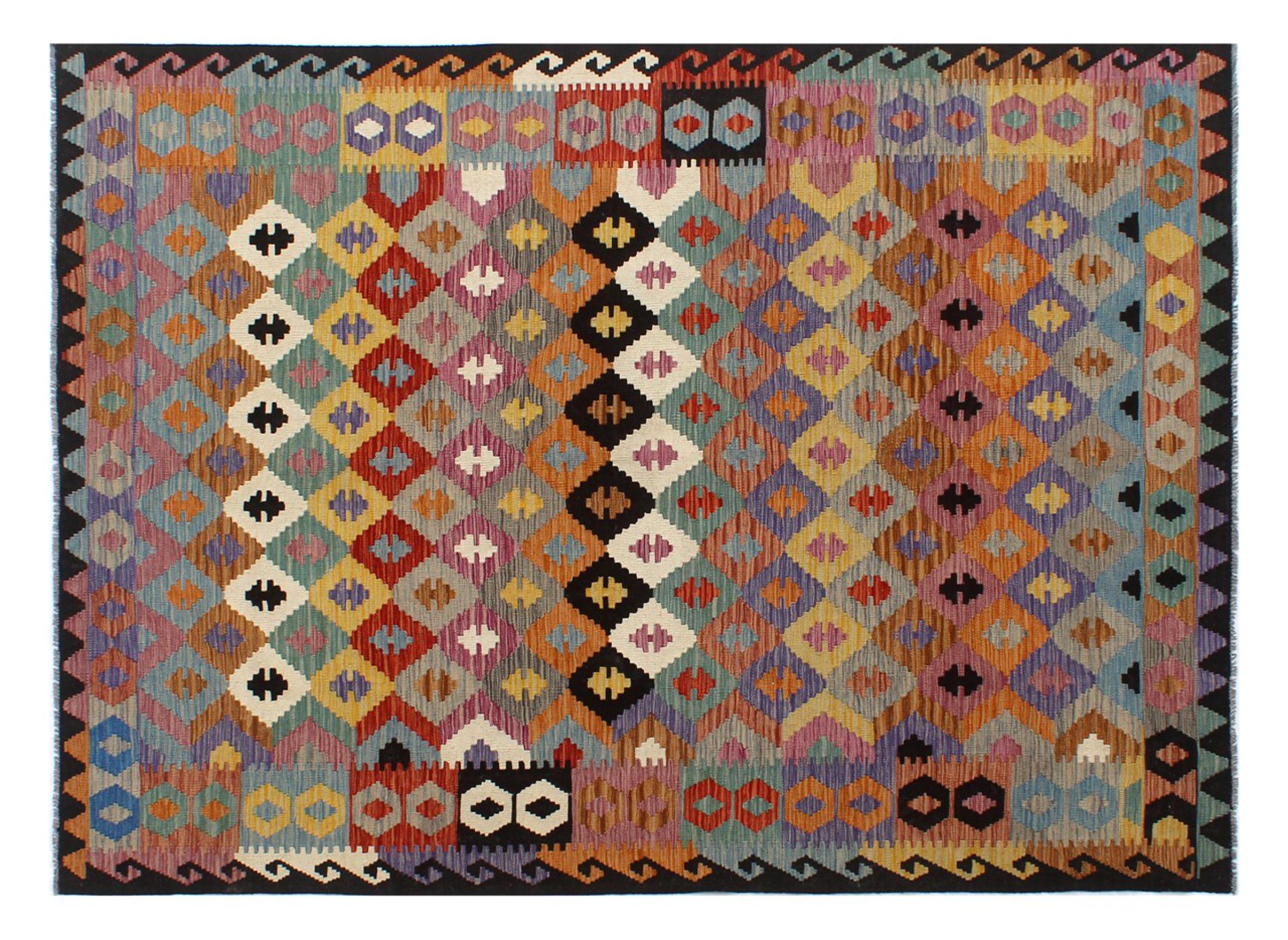 This Kilim Afghan rug has beautiful colors. It is handmade from fine wool. These patterns are traditional design elements that have already been used centuries ago. This particular kilim has been woven by hand in Afghanistan, a country with a long history in weaving and knotting rugs. The rug is robust and can be laid out on both sides.