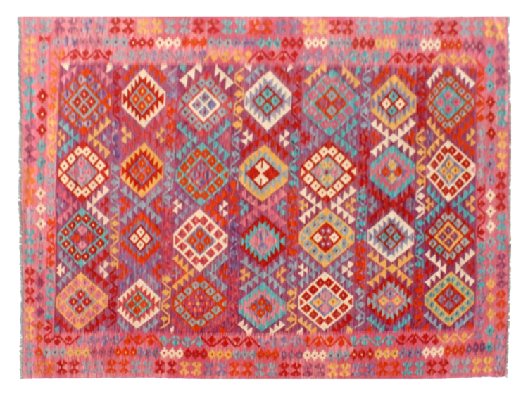 These Kilim rugs have a significant difference from hand-knotted rugs—they are handwoven. As a result, they do not have a high pile of wool and are often flatter and rougher than knotted wool rugs. Their construction is less intricate, making them generally much more affordable. Additionally, Kilim rugs are much lighter and can be laid out on either side. Handwoven Kilims originally come from what was once Persia and are now also widely produced in Afghanistan. They typically feature simple, straight-line patterns, which are characteristic of their weaving technique.