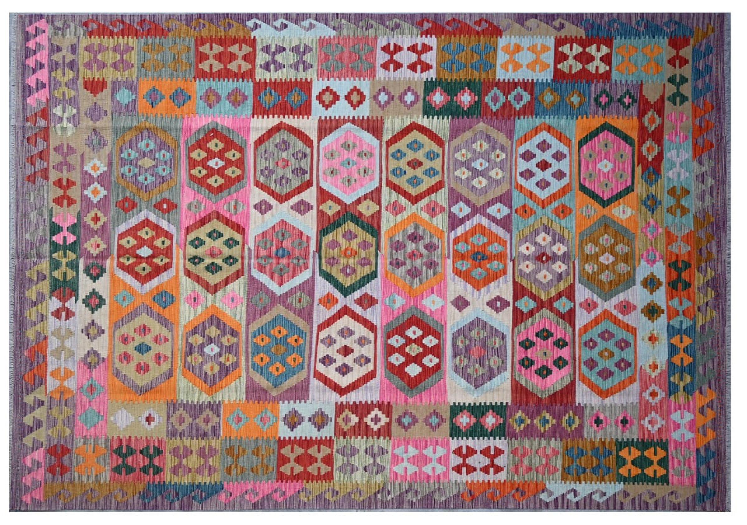 This Kilim Afghan rug has beautiful colors. It is handmade from fine wool. These patterns are traditional design elements that have already been used centuries ago. This particular kilim has been woven by hand in Afghanistan, a country with a long history in weaving and knotting rugs. The rug is robust and can be laid out on both sides.