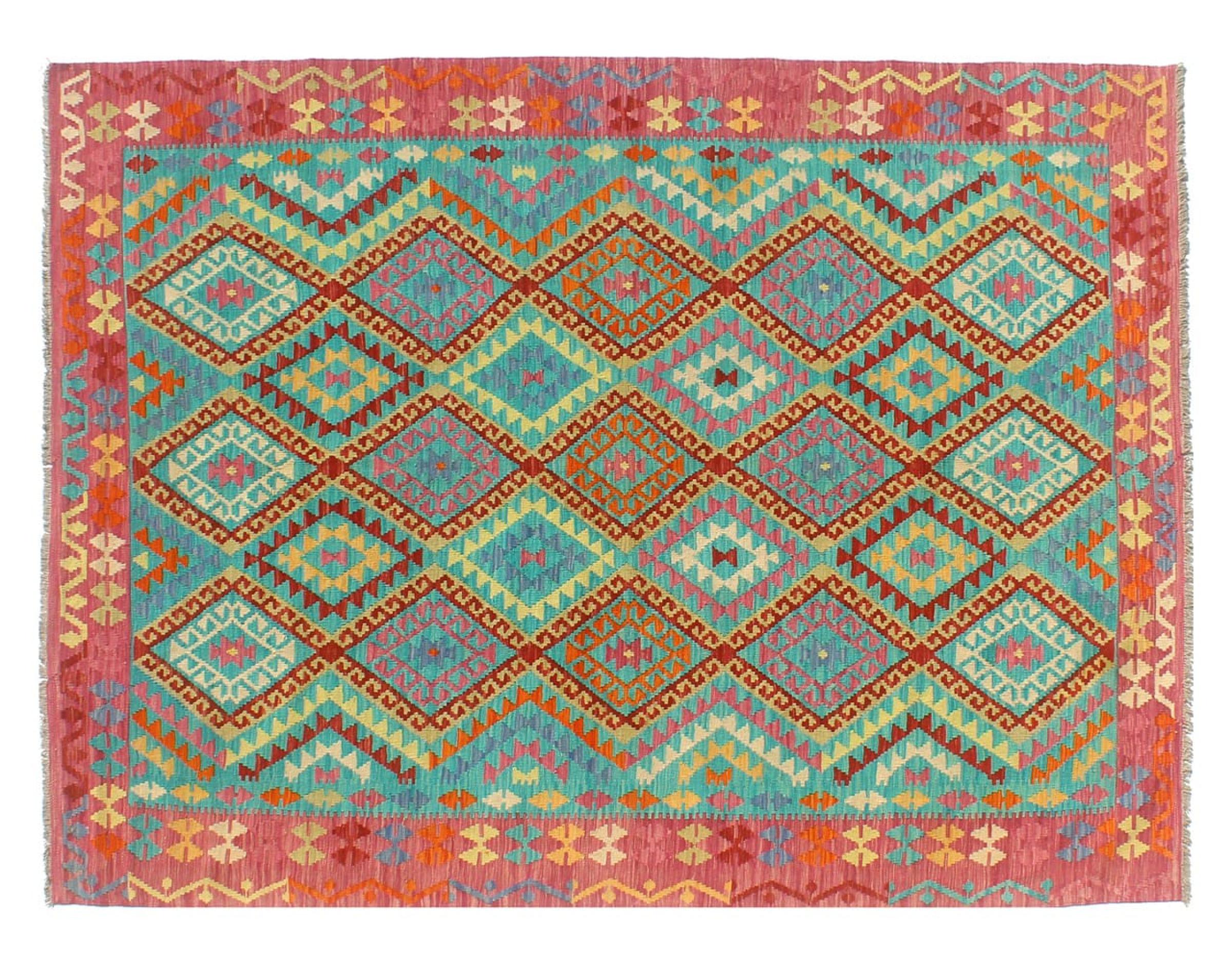 This Kilim Afghan rug has beautiful colors. It is handmade from fine wool. These patterns are traditional design elements that have already been used centuries ago. This particular kilim has been woven by hand in Afghanistan, a country with a long history in weaving and knotting rugs. The rug is robust and can be laid out on both sides.