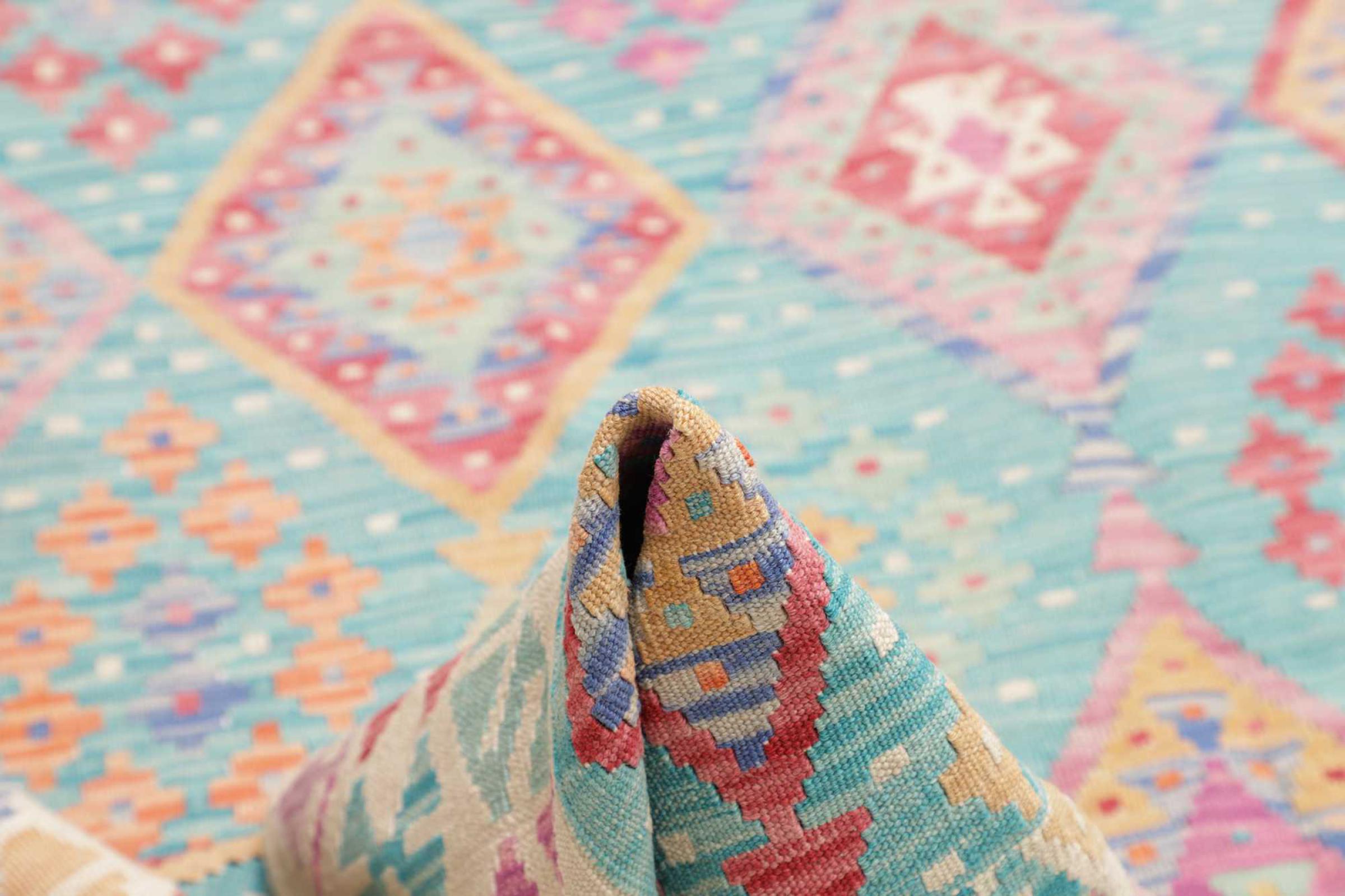 This Kilim Afghan rug has beautiful colors. It is handmade from fine wool. These patterns are traditional design elements that have already been used centuries ago. This particular kilim has been woven by hand in Afghanistan, a country with a long history in weaving and knotting rugs. The rug is robust and can be laid out on both sides.