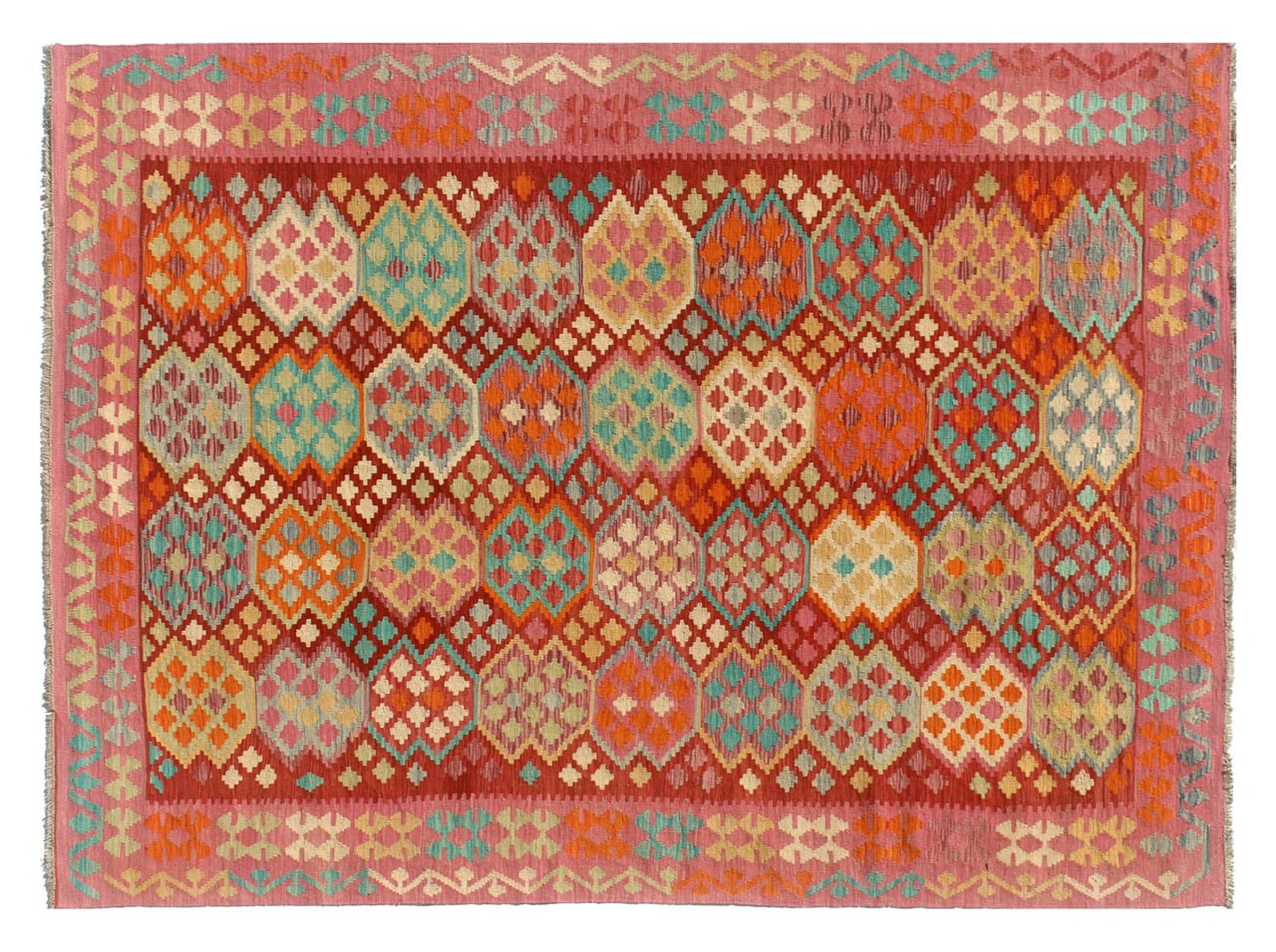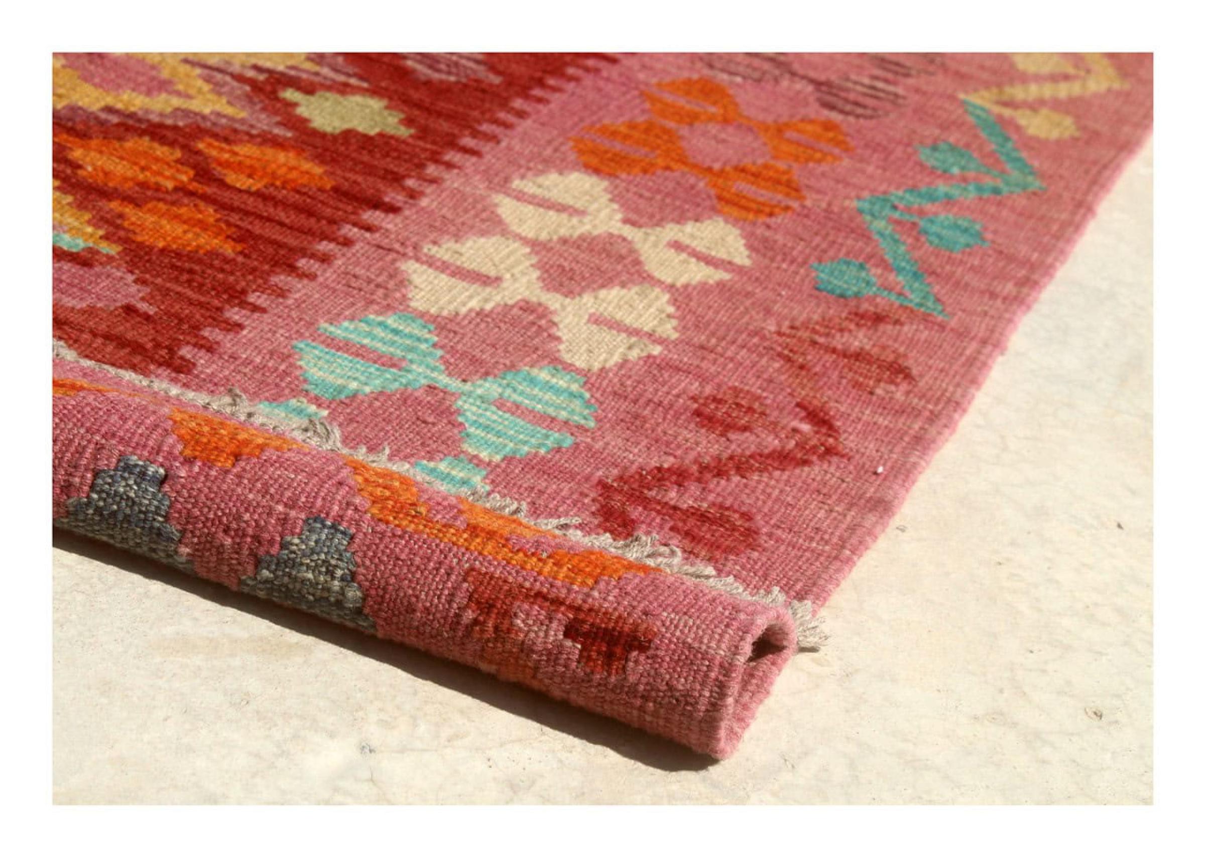 This Kilim Afghan rug has beautiful colors. It is handmade from fine wool. These patterns are traditional design elements that have already been used centuries ago. This particular kilim has been woven by hand in Afghanistan, a country with a long history in weaving and knotting rugs. The rug is robust and can be laid out on both sides.