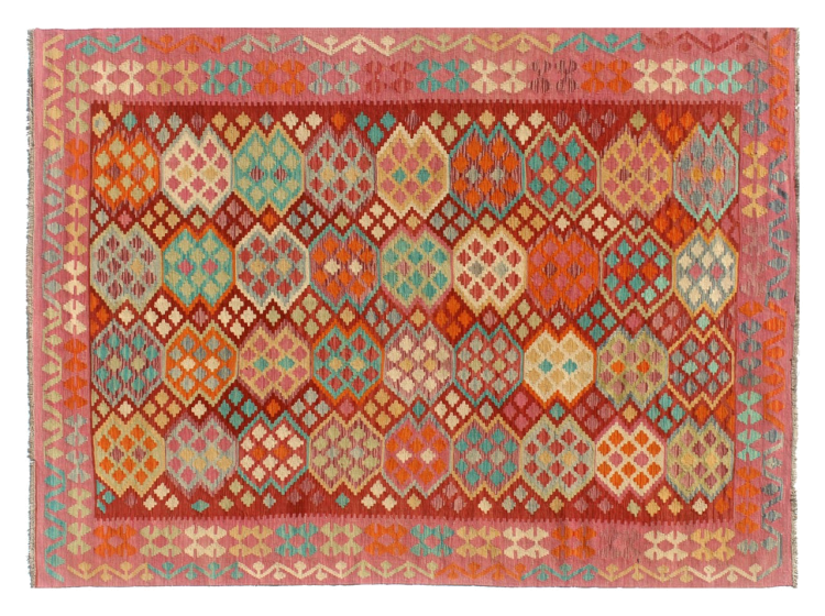 These Kilim rugs have a significant difference from hand-knotted rugs—they are handwoven. As a result, they do not have a high pile of wool and are often flatter and rougher than knotted wool rugs. Their construction is less intricate, making them generally much more affordable. Additionally, Kilim rugs are much lighter and can be laid out on either side. Handwoven Kilims originally come from what was once Persia and are now also widely produced in Afghanistan. They typically feature simple, straight-line patterns, which are characteristic of their weaving technique.