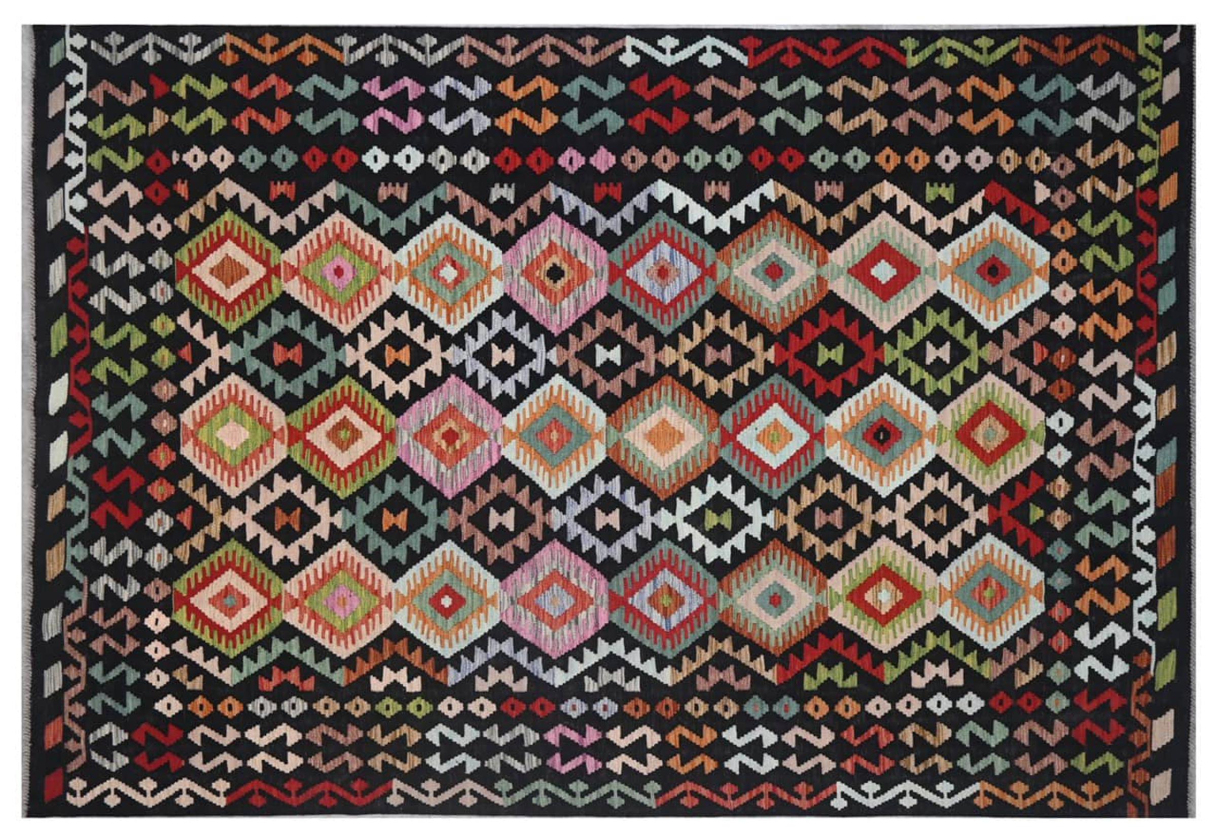 This Kilim Afghan rug has beautiful colors. It is handmade from fine wool. These patterns are traditional design elements that have already been used centuries ago. This particular kilim has been woven by hand in Afghanistan, a country with a long history in weaving and knotting rugs. The rug is robust and can be laid out on both sides.