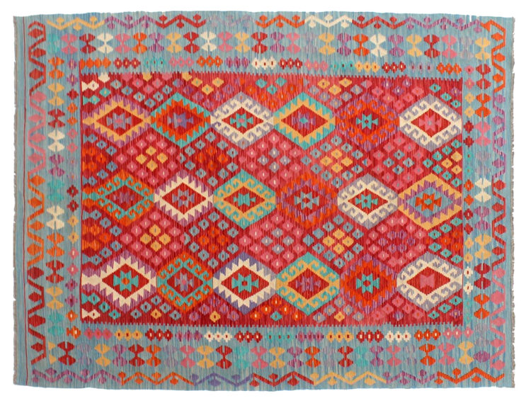 These Kilim rugs have a significant difference from hand-knotted rugs—they are handwoven. As a result, they do not have a high pile of wool and are often flatter and rougher than knotted wool rugs. Their construction is less intricate, making them generally much more affordable. Additionally, Kilim rugs are much lighter and can be laid out on either side. Handwoven Kilims originally come from what was once Persia and are now also widely produced in Afghanistan. They typically feature simple, straight-line patterns, which are characteristic of their weaving technique.
