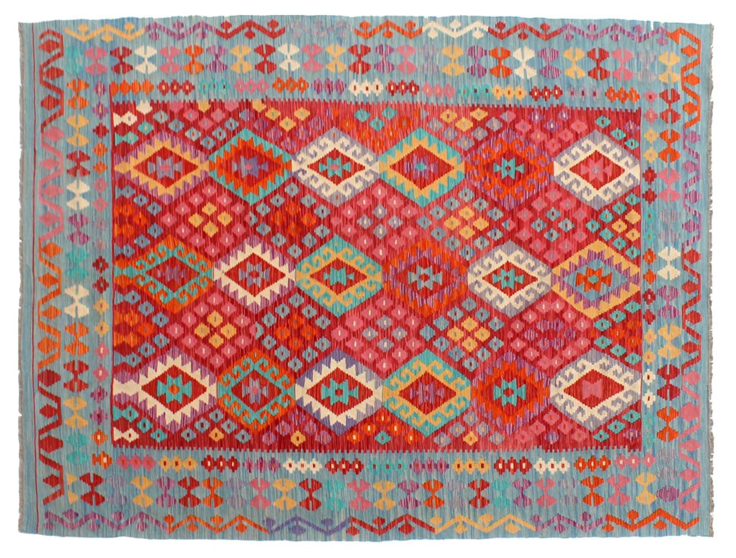 This Kilim Afghan rug has beautiful colors. It is handmade from fine wool. These patterns are traditional design elements that have already been used centuries ago. This particular kilim has been woven by hand in Afghanistan, a country with a long history in weaving and knotting rugs. The rug is robust and can be laid out on both sides.