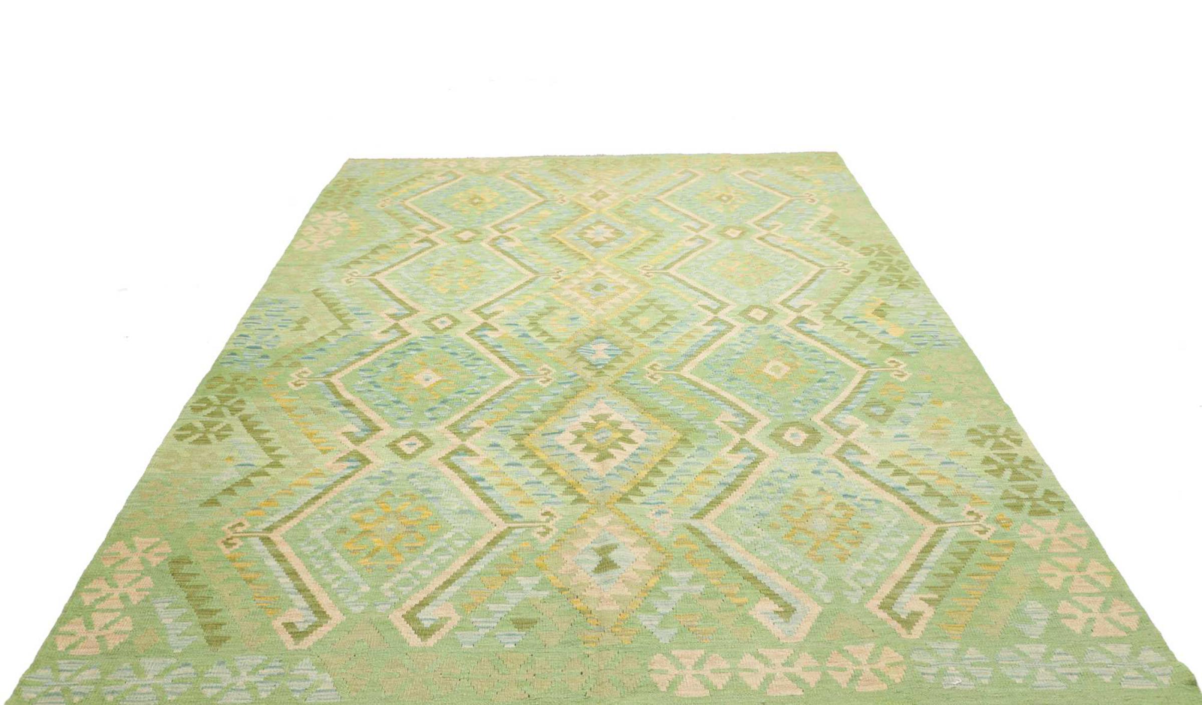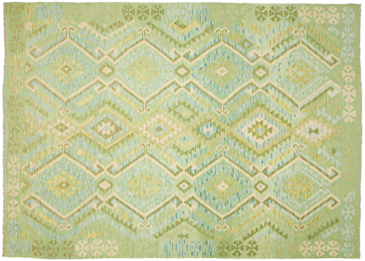 These Kilim rugs have a significant difference from hand-knotted rugs—they are handwoven. As a result, they do not have a high pile of wool and are often flatter and rougher than knotted wool rugs. Their construction is less intricate, making them generally much more affordable. Additionally, Kilim rugs are much lighter and can be laid out on either side. Handwoven Kilims originally come from what was once Persia and are now also widely produced in Afghanistan. They typically feature simple, straight-line patterns, which are characteristic of their weaving technique.