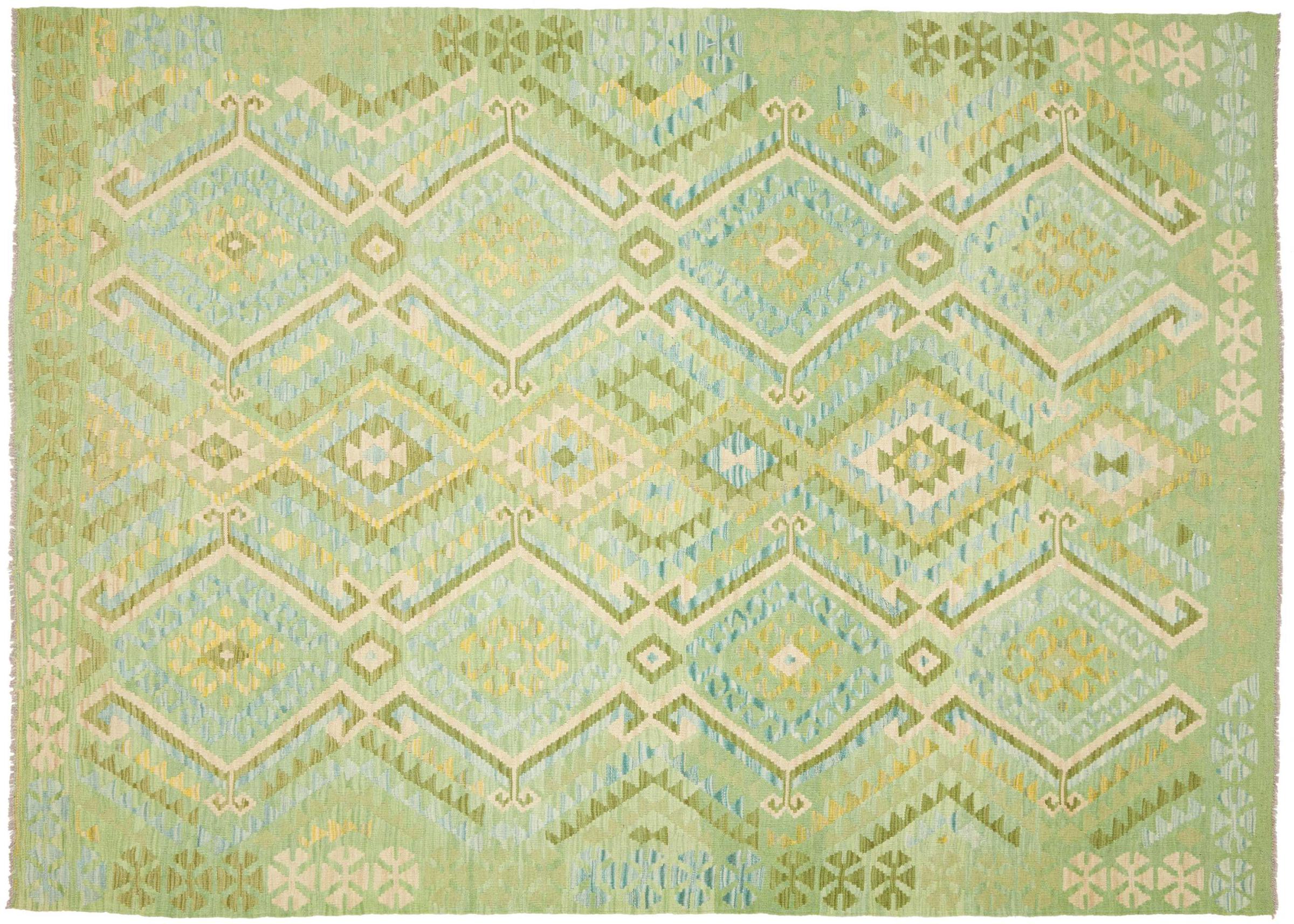 This Kilim Afghan rug has beautiful colors. It is handmade from fine wool. These patterns are traditional design elements that have already been used centuries ago. This particular kilim has been woven by hand in Afghanistan, a country with a long history in weaving and knotting rugs. The rug is robust and can be laid out on both sides.