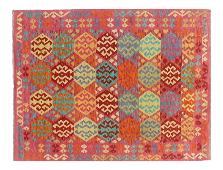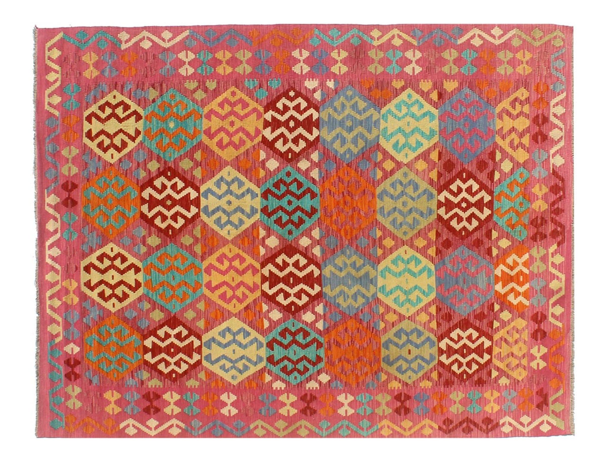 This Kilim Afghan rug has beautiful colors. It is handmade from fine wool. These patterns are traditional design elements that have already been used centuries ago. This particular kilim has been woven by hand in Afghanistan, a country with a long history in weaving and knotting rugs. The rug is robust and can be laid out on both sides.
