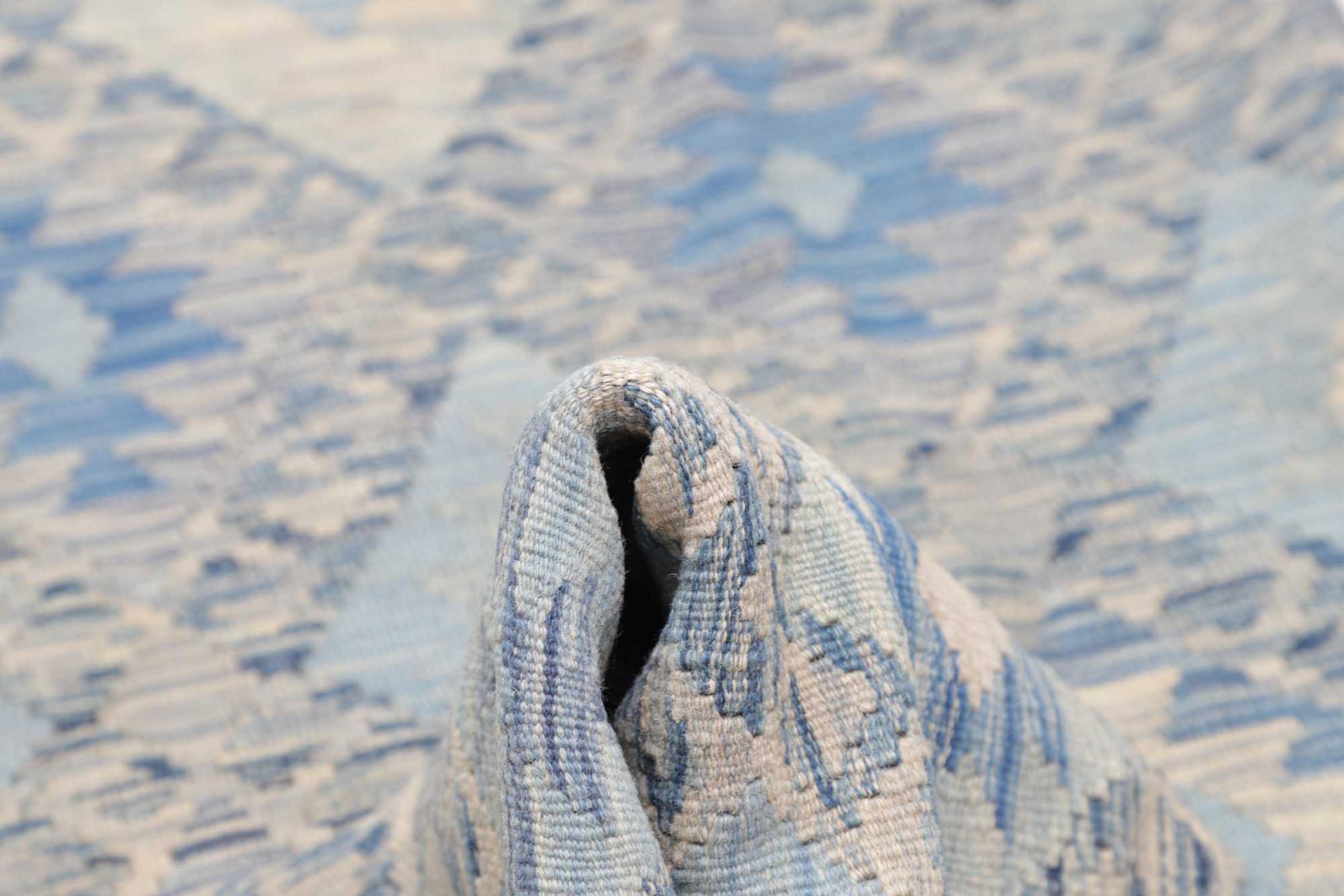 This rug was made as a flat weave by hand on a loom. Flatweave is the term used to describe rugs that have no pile. As the name promises, these rugs are woven and not knotted. This results in a flat rug with a structured surface. Flatweaves are not as soft and usually thinner than knotted rugs. At the same time they are much less complex to manufacture and can usually be laid out from both sides (front and back). Their patterns are usually geometric, which is determined by the fabric.