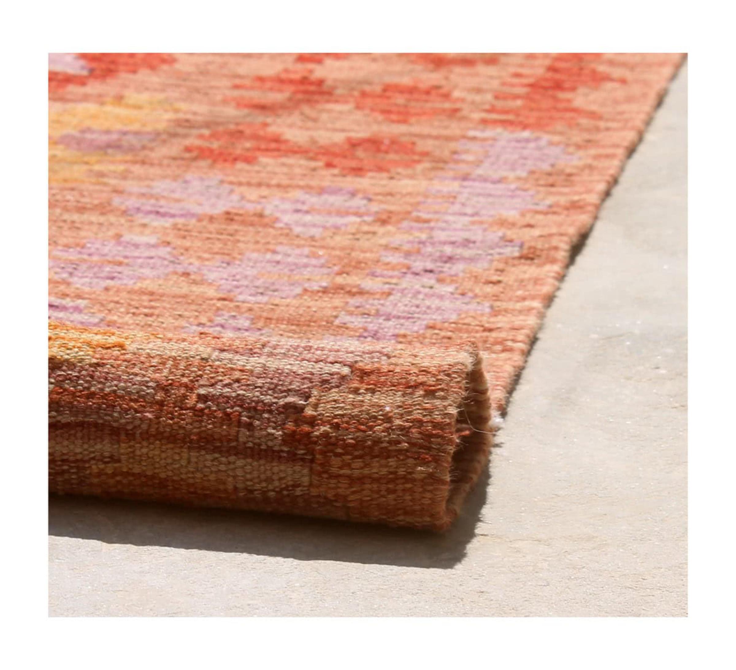 This rug was made as a flat weave by hand on a loom. Flatweave is the term used to describe rugs that have no pile. As the name promises, these rugs are woven and not knotted. This results in a flat rug with a structured surface. Flatweaves are not as soft and usually thinner than knotted rugs. At the same time they are much less complex to manufacture and can usually be laid out from both sides (front and back). Their patterns are usually geometric, which is determined by the fabric.