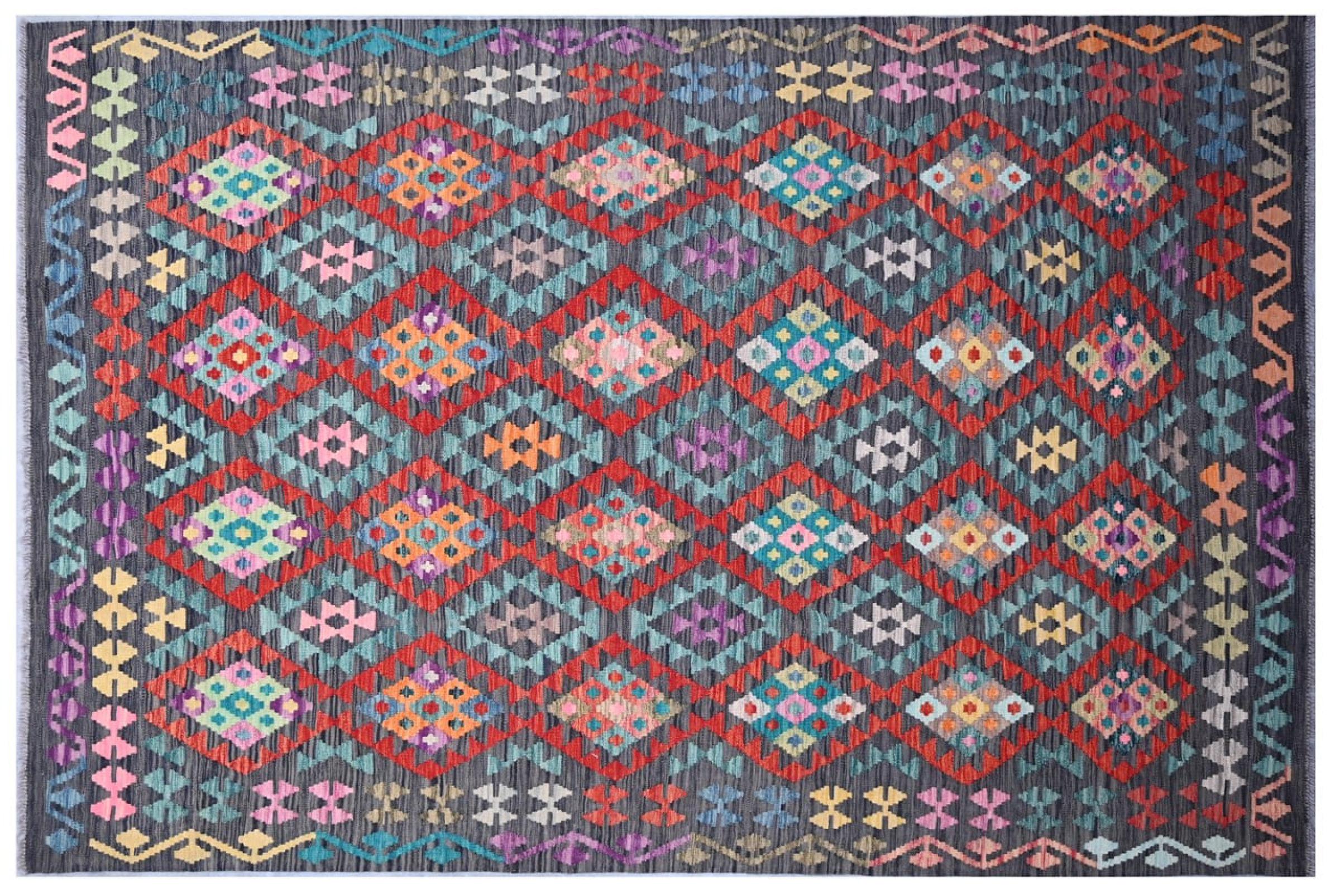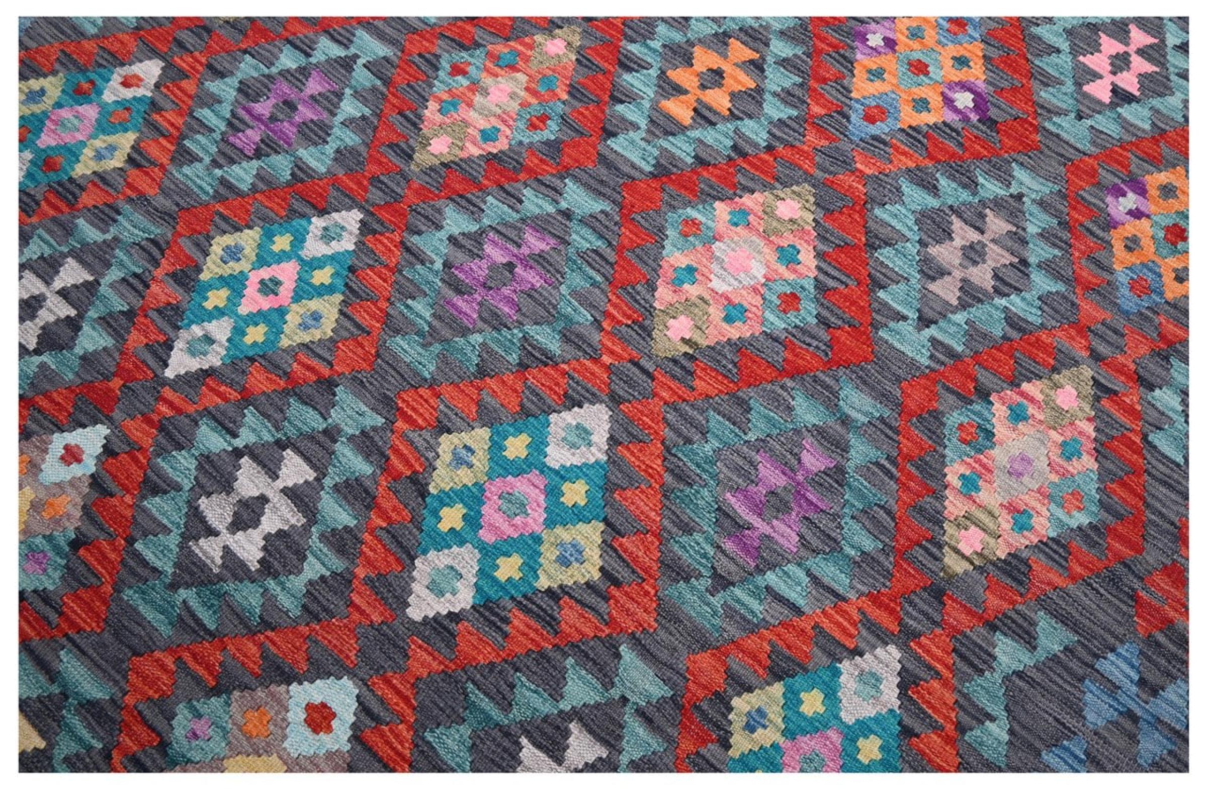 This Kilim Afghan rug has beautiful colors. It is handmade from fine wool. These patterns are traditional design elements that have already been used centuries ago. This particular kilim has been woven by hand in Afghanistan, a country with a long history in weaving and knotting rugs. The rug is robust and can be laid out on both sides.