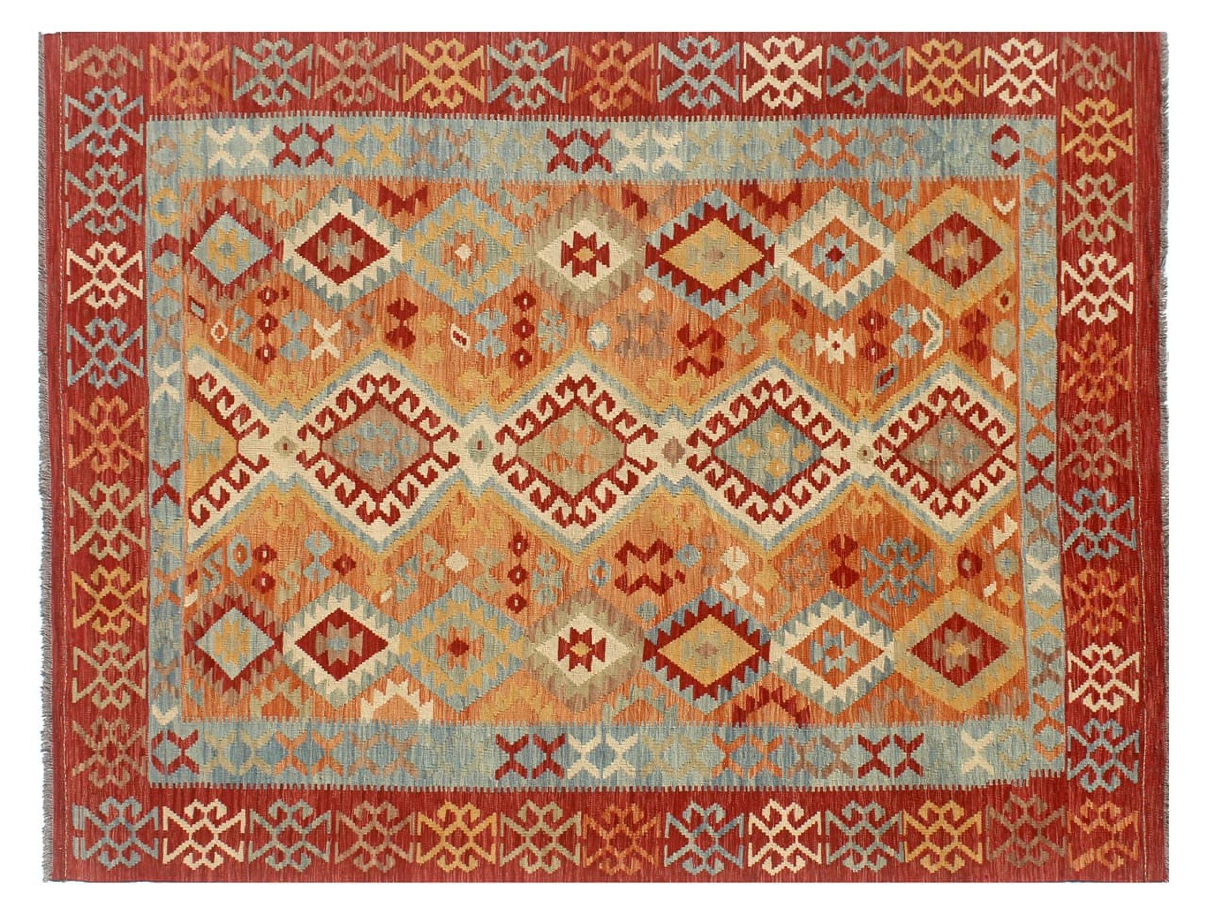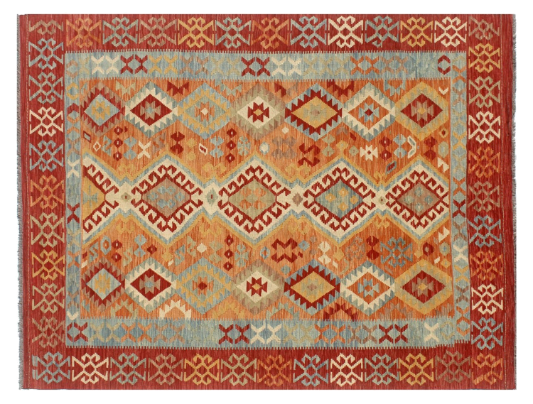 These Kilim rugs have a significant difference from hand-knotted rugs—they are handwoven. As a result, they do not have a high pile of wool and are often flatter and rougher than knotted wool rugs. Their construction is less intricate, making them generally much more affordable. Additionally, Kilim rugs are much lighter and can be laid out on either side. Handwoven Kilims originally come from what was once Persia and are now also widely produced in Afghanistan. They typically feature simple, straight-line patterns, which are characteristic of their weaving technique.