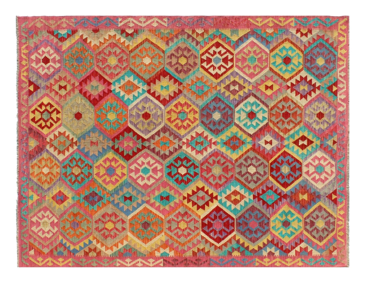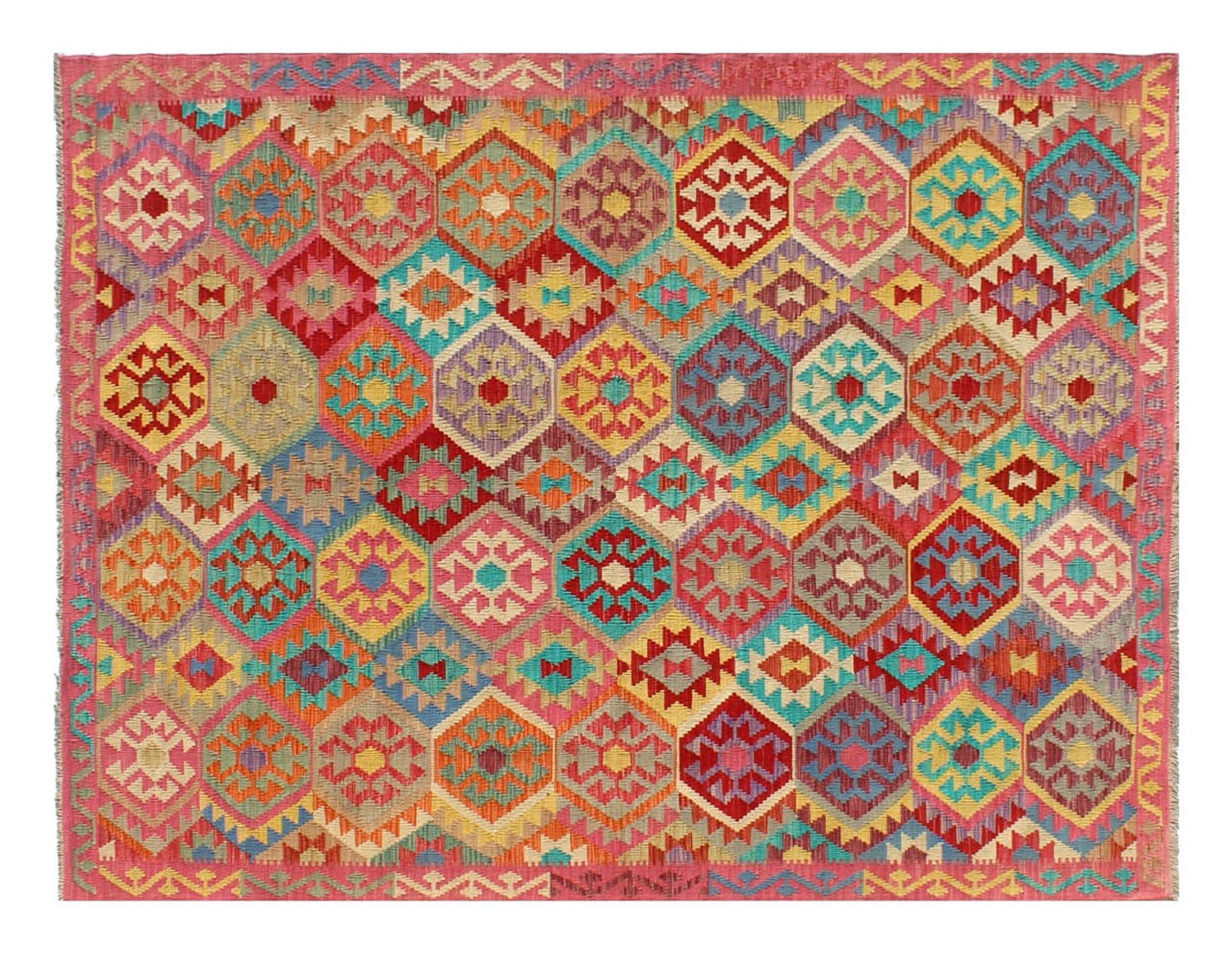 This Kilim Afghan rug has beautiful colors. It is handmade from fine wool. These patterns are traditional design elements that have already been used centuries ago. This particular kilim has been woven by hand in Afghanistan, a country with a long history in weaving and knotting rugs. The rug is robust and can be laid out on both sides.