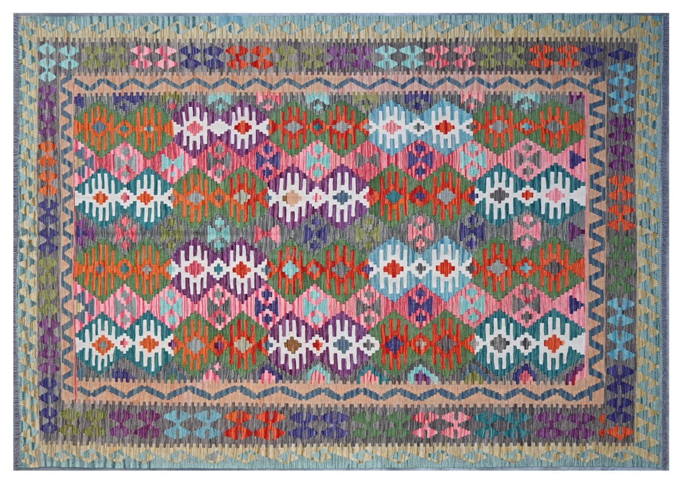 This Kilim Afghan rug has beautiful colors. It is handmade from fine wool. These patterns are traditional design elements that have already been used centuries ago. This particular kilim has been woven by hand in Afghanistan, a country with a long history in weaving and knotting rugs. The rug is robust and can be laid out on both sides.