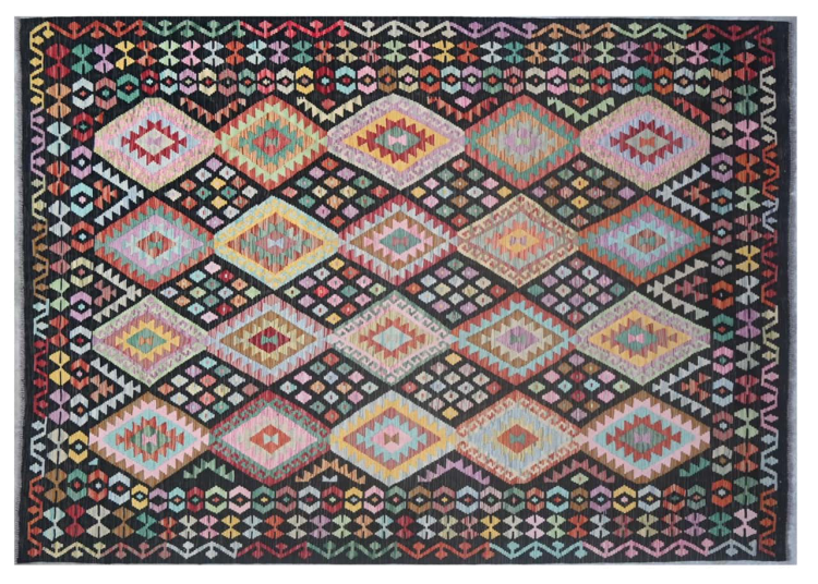 These Kilim rugs have a significant difference from hand-knotted rugs—they are handwoven. As a result, they do not have a high pile of wool and are often flatter and rougher than knotted wool rugs. Their construction is less intricate, making them generally much more affordable. Additionally, Kilim rugs are much lighter and can be laid out on either side. Handwoven Kilims originally come from what was once Persia and are now also widely produced in Afghanistan. They typically feature simple, straight-line patterns, which are characteristic of their weaving technique.