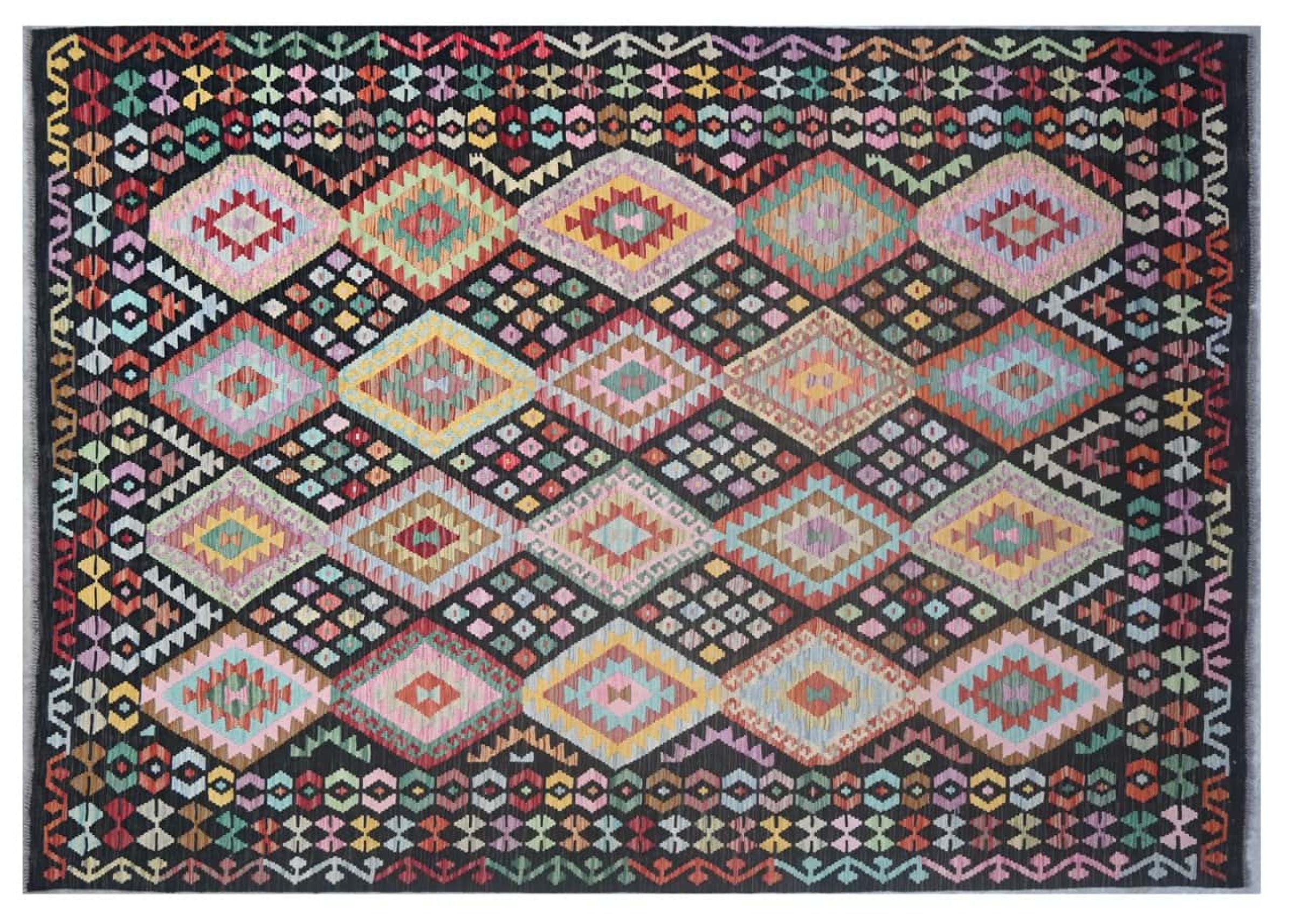 This Kilim Afghan rug has beautiful colors. It is handmade from fine wool. These patterns are traditional design elements that have already been used centuries ago. This particular kilim has been woven by hand in Afghanistan, a country with a long history in weaving and knotting rugs. The rug is robust and can be laid out on both sides.