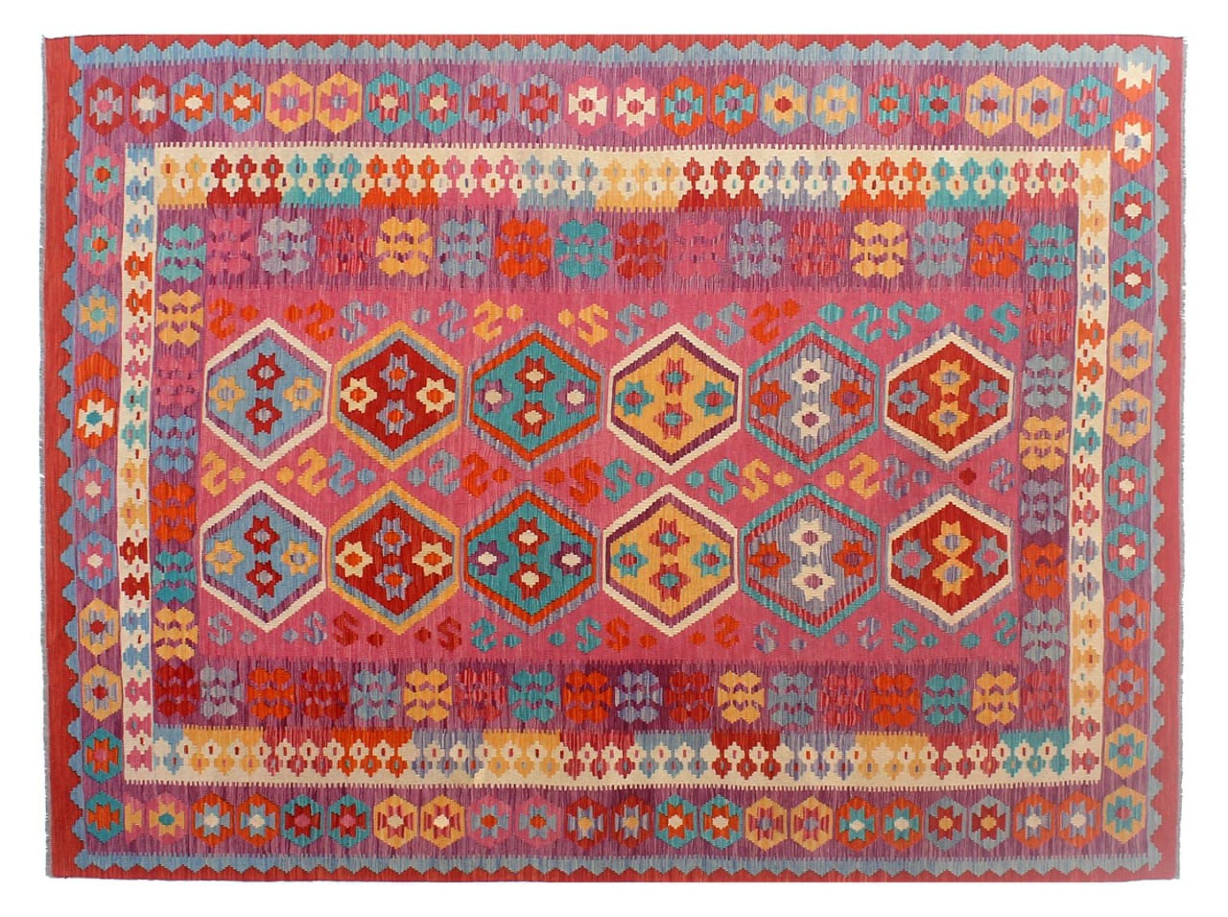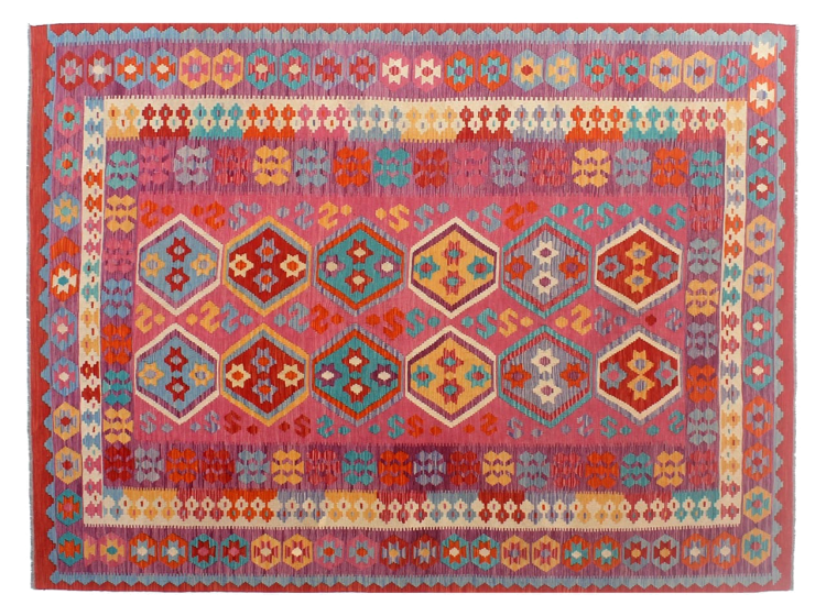 These Kilim rugs have a significant difference from hand-knotted rugs—they are handwoven. As a result, they do not have a high pile of wool and are often flatter and rougher than knotted wool rugs. Their construction is less intricate, making them generally much more affordable. Additionally, Kilim rugs are much lighter and can be laid out on either side. Handwoven Kilims originally come from what was once Persia and are now also widely produced in Afghanistan. They typically feature simple, straight-line patterns, which are characteristic of their weaving technique.