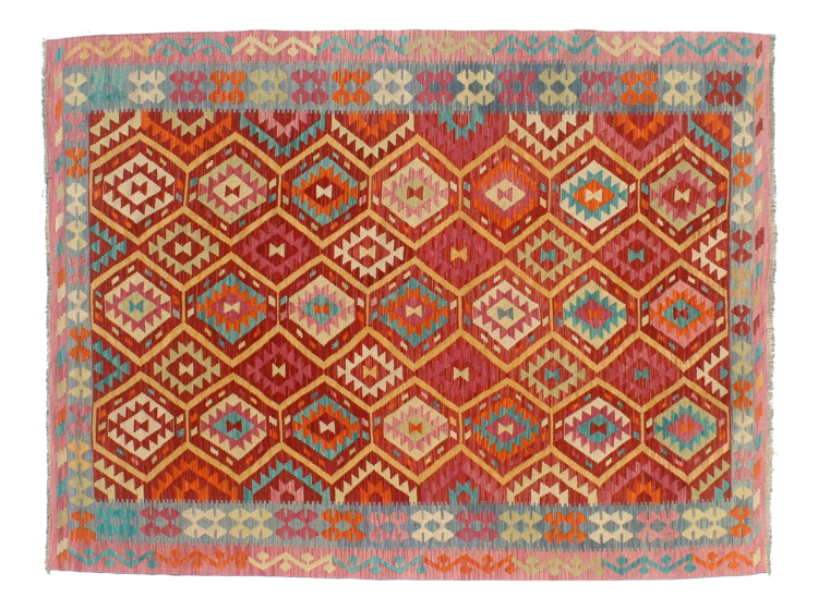 These Kilim rugs have a significant difference from hand-knotted rugs—they are handwoven. As a result, they do not have a high pile of wool and are often flatter and rougher than knotted wool rugs. Their construction is less intricate, making them generally much more affordable. Additionally, Kilim rugs are much lighter and can be laid out on either side. Handwoven Kilims originally come from what was once Persia and are now also widely produced in Afghanistan. They typically feature simple, straight-line patterns, which are characteristic of their weaving technique.