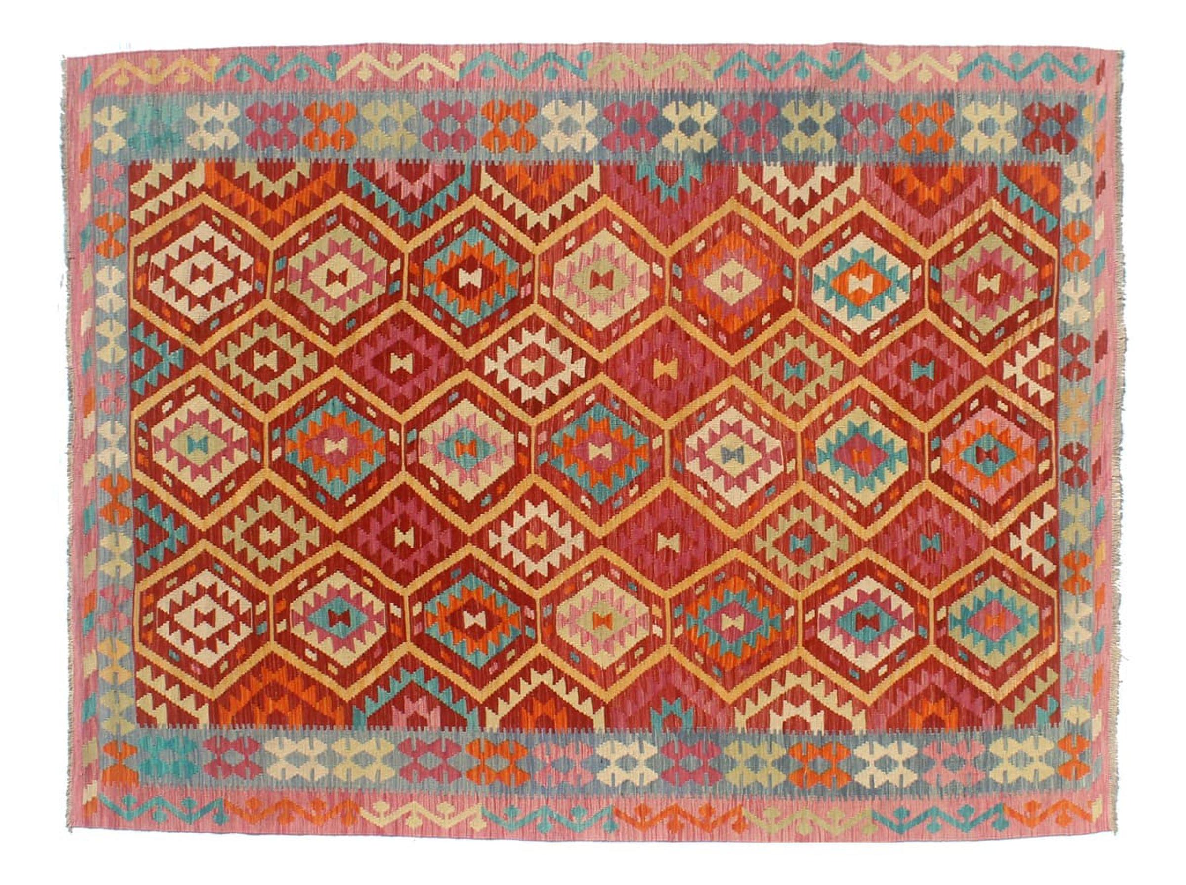 This Kilim Afghan rug has beautiful colors. It is handmade from fine wool. These patterns are traditional design elements that have already been used centuries ago. This particular kilim has been woven by hand in Afghanistan, a country with a long history in weaving and knotting rugs. The rug is robust and can be laid out on both sides.