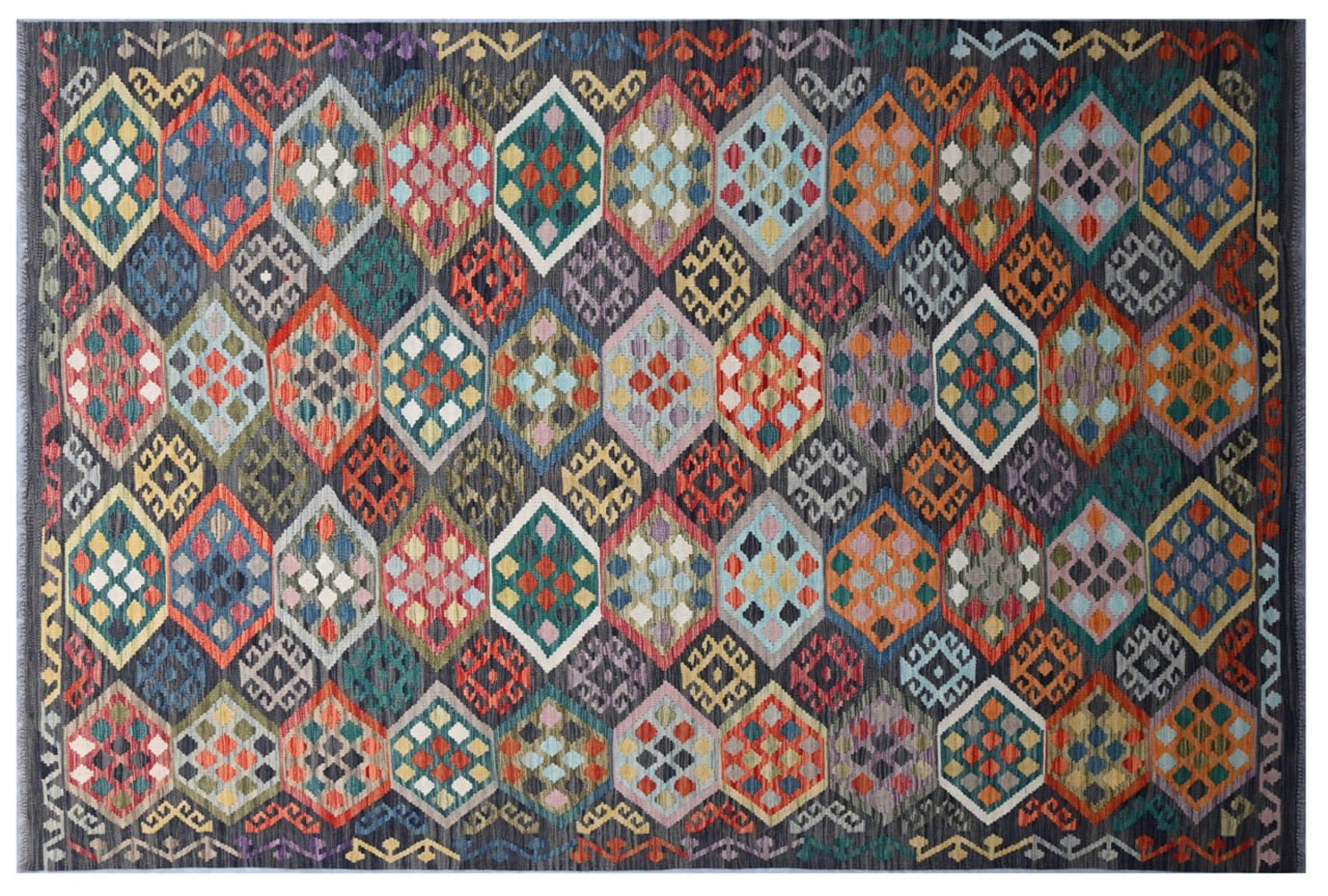 This Kilim Afghan rug has beautiful colors. It is handmade from fine wool. These patterns are traditional design elements that have already been used centuries ago. This particular kilim has been woven by hand in Afghanistan, a country with a long history in weaving and knotting rugs. The rug is robust and can be laid out on both sides.