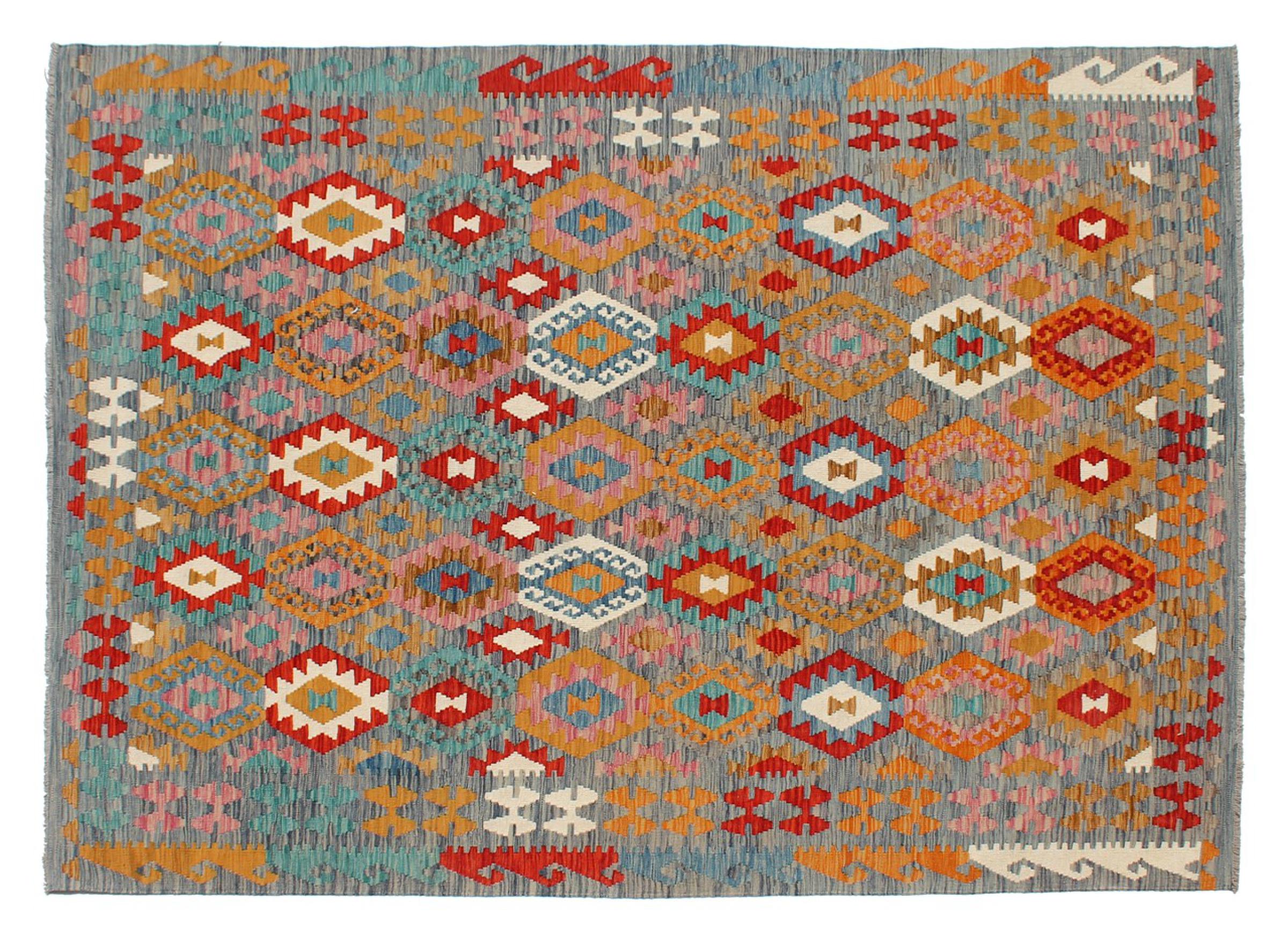 This Kilim Afghan rug has beautiful colors. It is handmade from fine wool. These patterns are traditional design elements that have already been used centuries ago. This particular kilim has been woven by hand in Afghanistan, a country with a long history in weaving and knotting rugs. The rug is robust and can be laid out on both sides.