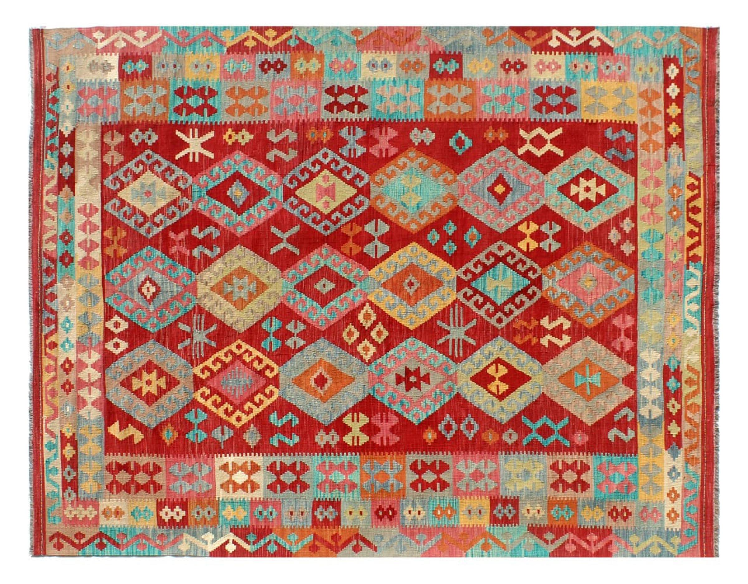 This Kilim Afghan rug has beautiful colors. It is handmade from fine wool. These patterns are traditional design elements that have already been used centuries ago. This particular kilim has been woven by hand in Afghanistan, a country with a long history in weaving and knotting rugs. The rug is robust and can be laid out on both sides.