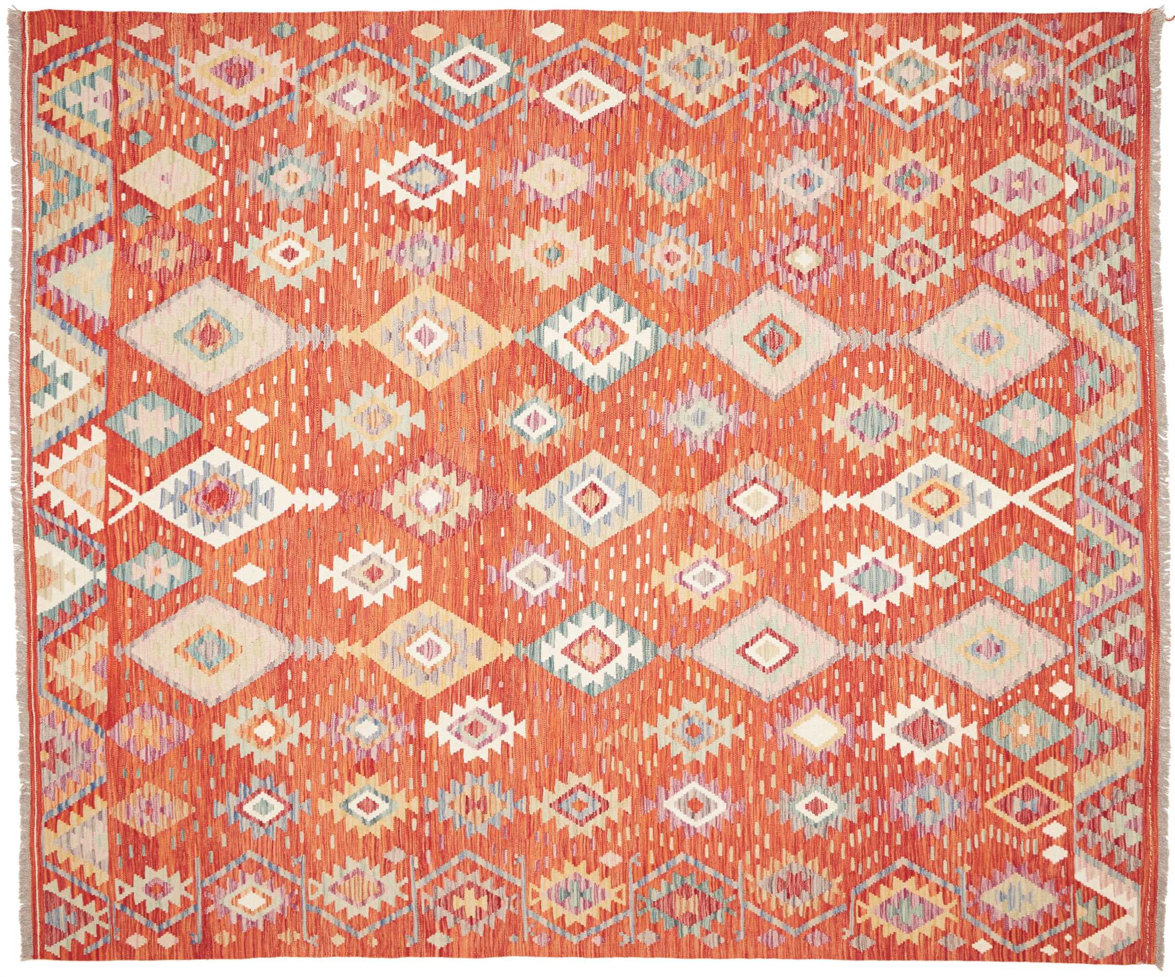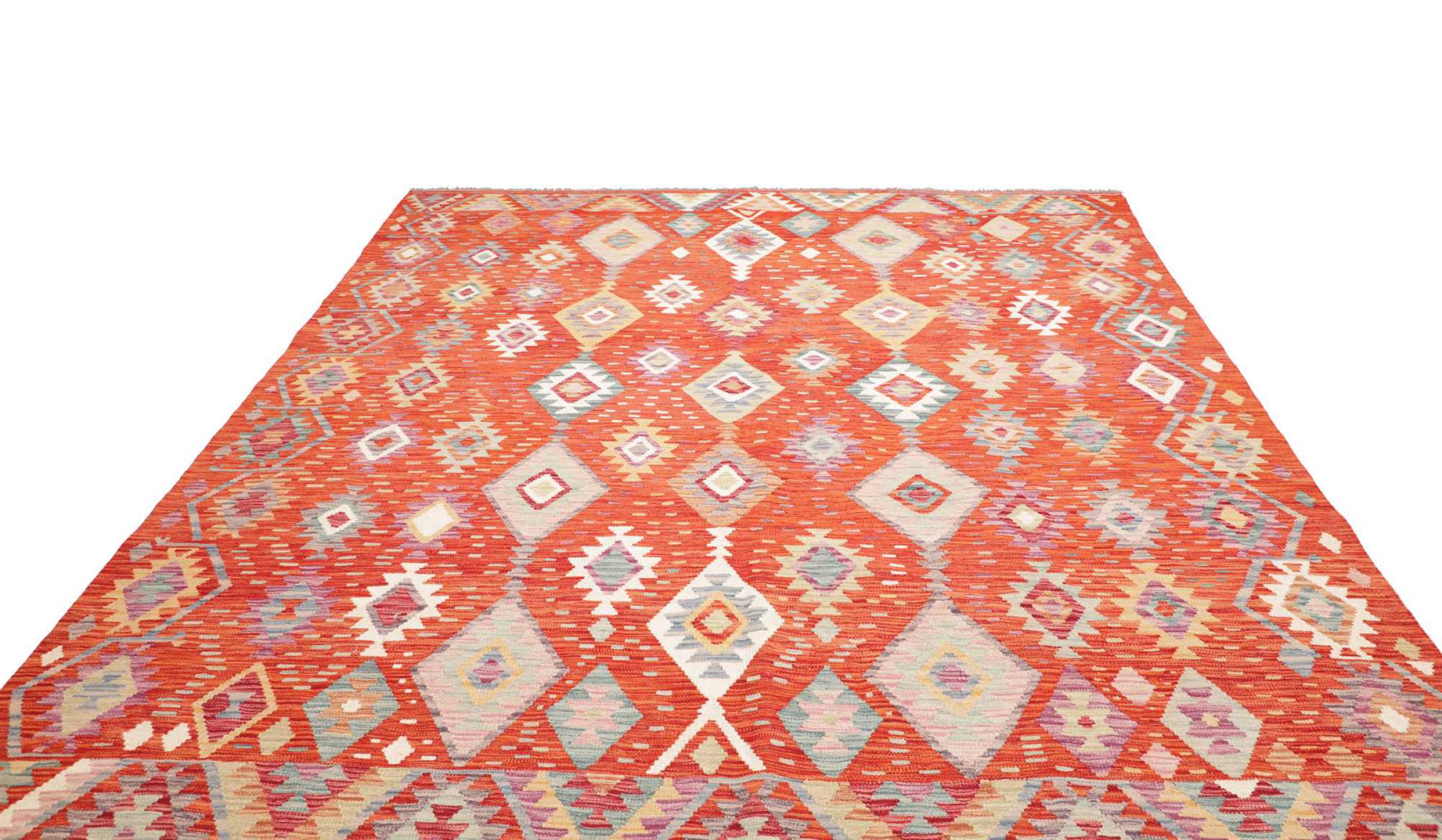 These Kilim rugs have a significant difference from hand-knotted rugs—they are handwoven. As a result, they do not have a high pile of wool and are often flatter and rougher than knotted wool rugs. Their construction is less intricate, making them generally much more affordable. Additionally, Kilim rugs are much lighter and can be laid out on either side. Handwoven Kilims originally come from what was once Persia and are now also widely produced in Afghanistan. They typically feature simple, straight-line patterns, which are characteristic of their weaving technique.