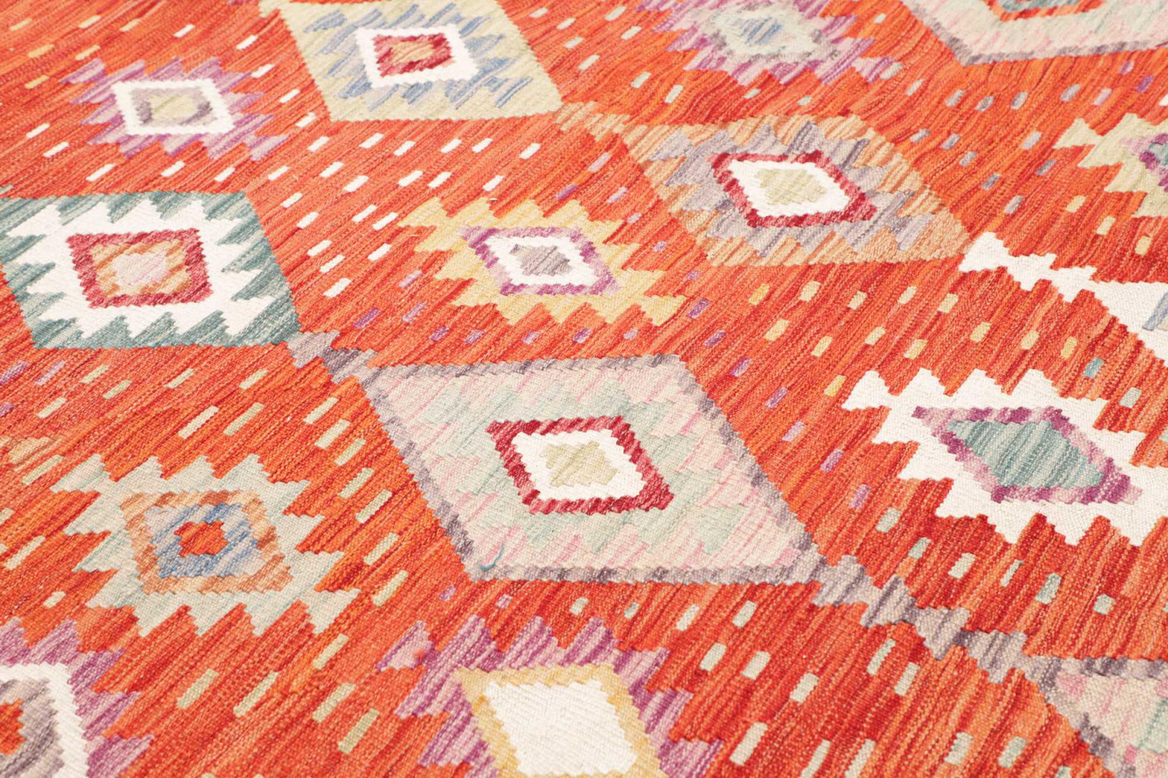 This Kilim Afghan rug has beautiful colors. It is handmade from fine wool. These patterns are traditional design elements that have already been used centuries ago. This particular kilim has been woven by hand in Afghanistan, a country with a long history in weaving and knotting rugs. The rug is robust and can be laid out on both sides.