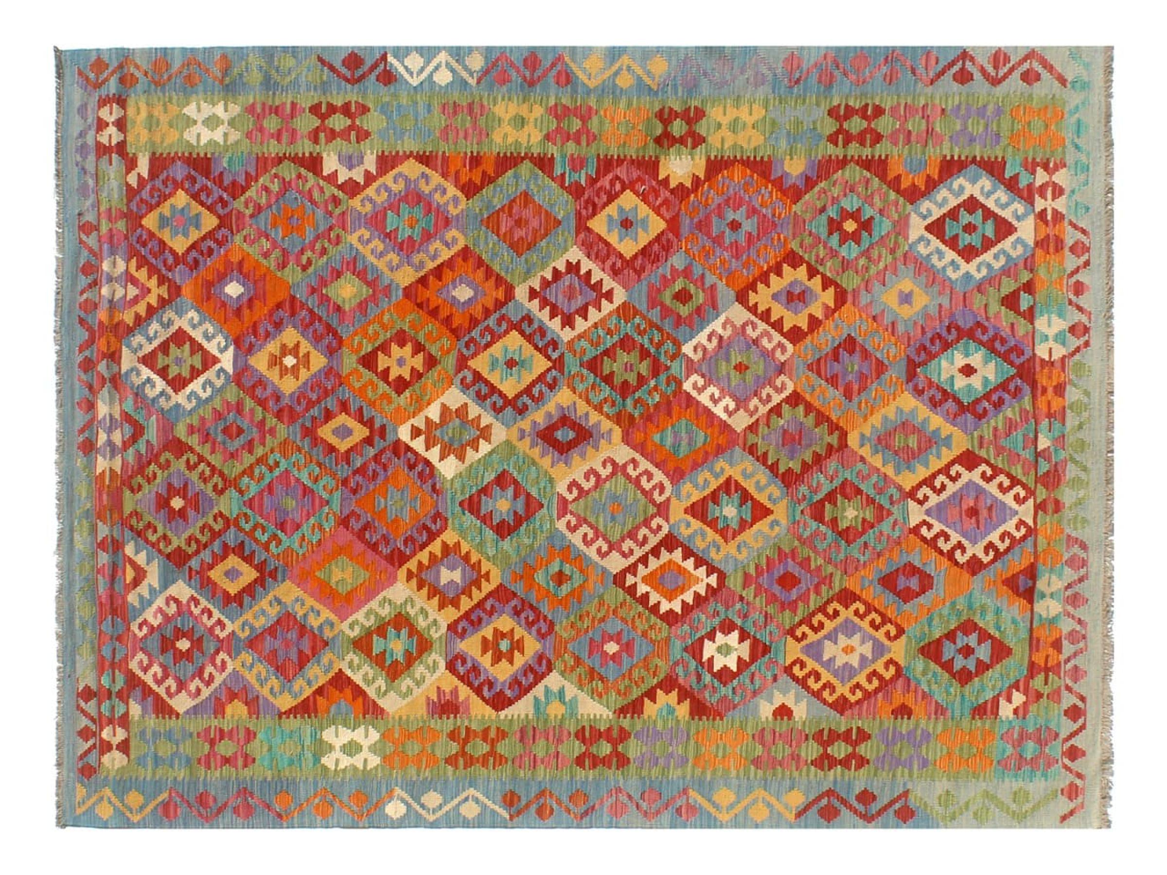 This Kilim Afghan rug has beautiful colors. It is handmade from fine wool. These patterns are traditional design elements that have already been used centuries ago. This particular kilim has been woven by hand in Afghanistan, a country with a long history in weaving and knotting rugs. The rug is robust and can be laid out on both sides.