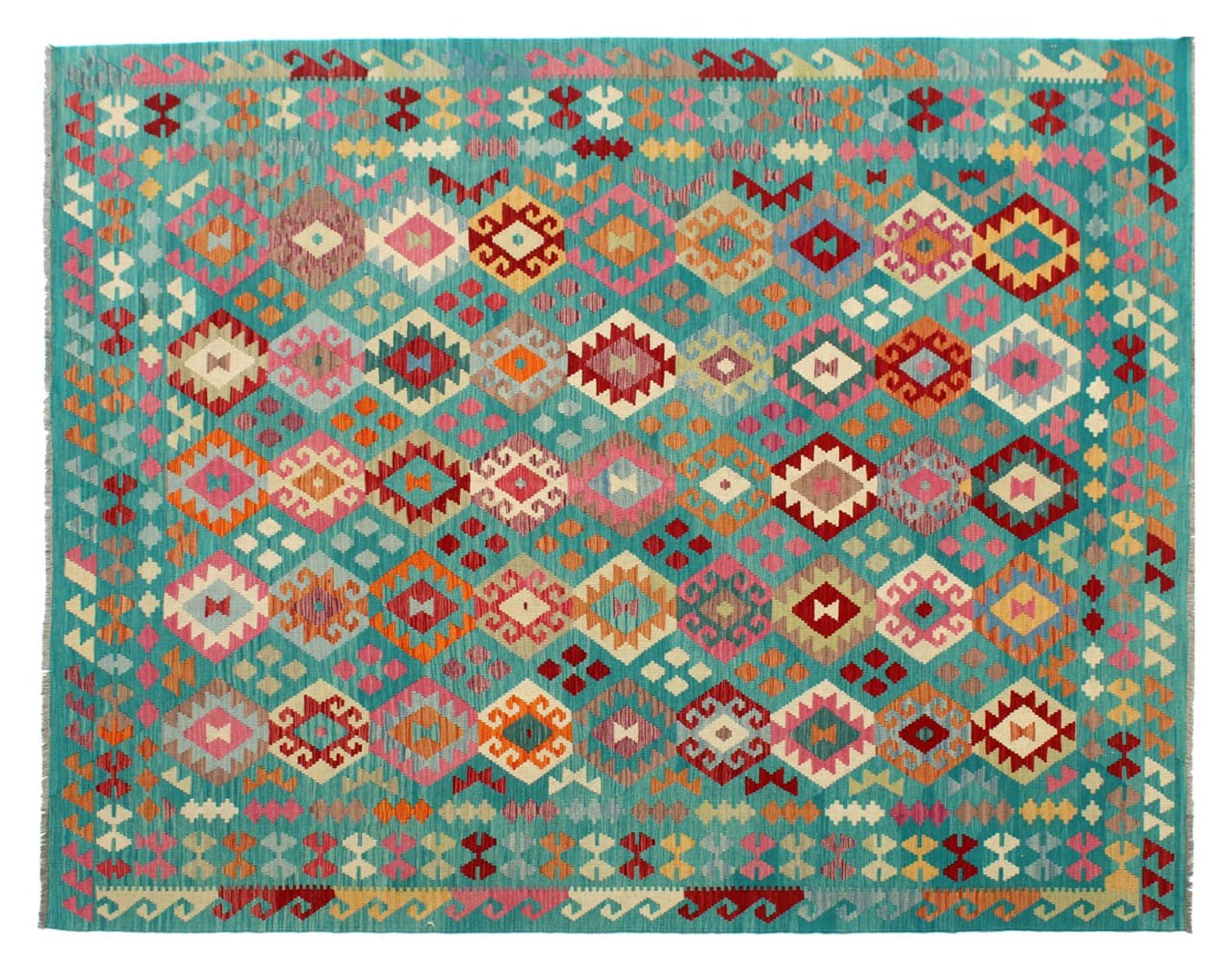 This Kilim Afghan rug has beautiful colors. It is handmade from fine wool. These patterns are traditional design elements that have already been used centuries ago. This particular kilim has been woven by hand in Afghanistan, a country with a long history in weaving and knotting rugs. The rug is robust and can be laid out on both sides.