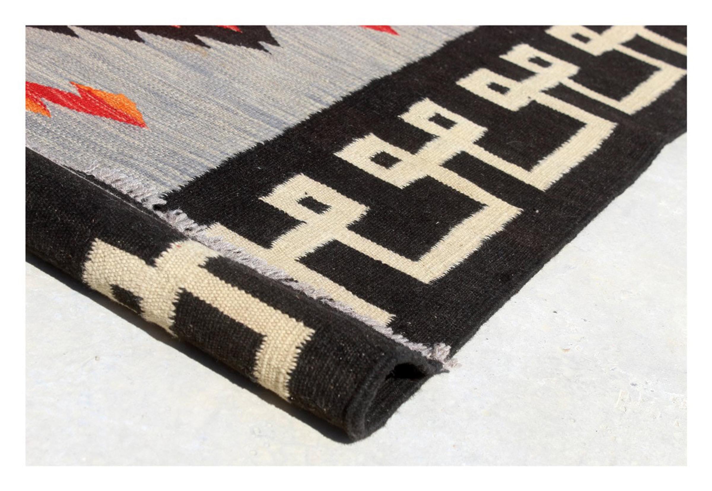 This rug was made as a flat weave by hand on a loom. Flatweave is the term used to describe rugs that have no pile. As the name promises, these rugs are woven and not knotted. This results in a flat rug with a structured surface. Flatweaves are not as soft and usually thinner than knotted rugs. At the same time they are much less complex to manufacture and can usually be laid out from both sides (front and back). Their patterns are usually geometric, which is determined by the fabric.