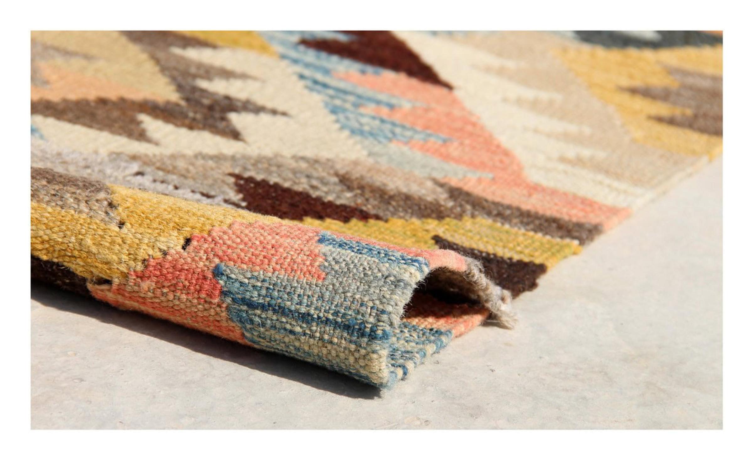 This rug was made as a flat weave by hand on a loom. Flatweave is the term used to describe rugs that have no pile. As the name promises, these rugs are woven and not knotted. This results in a flat rug with a structured surface. Flatweaves are not as soft and usually thinner than knotted rugs. At the same time they are much less complex to manufacture and can usually be laid out from both sides (front and back). Their patterns are usually geometric, which is determined by the fabric.