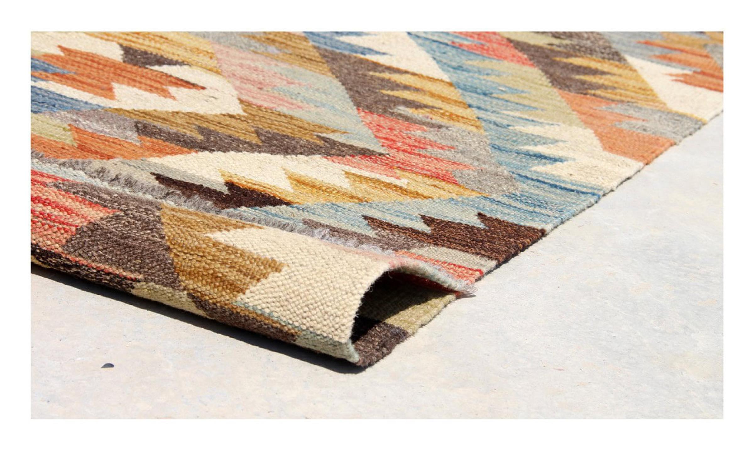 These Kilim rugs have a significant difference from hand-knotted rugs—they are handwoven. As a result, they do not have a high pile of wool and are often flatter and rougher than knotted wool rugs. Their construction is less intricate, making them generally much more affordable. Additionally, Kilim rugs are much lighter and can be laid out on either side. Handwoven Kilims originally come from what was once Persia and are now also widely produced in Afghanistan. They typically feature simple, straight-line patterns, which are characteristic of their weaving technique.