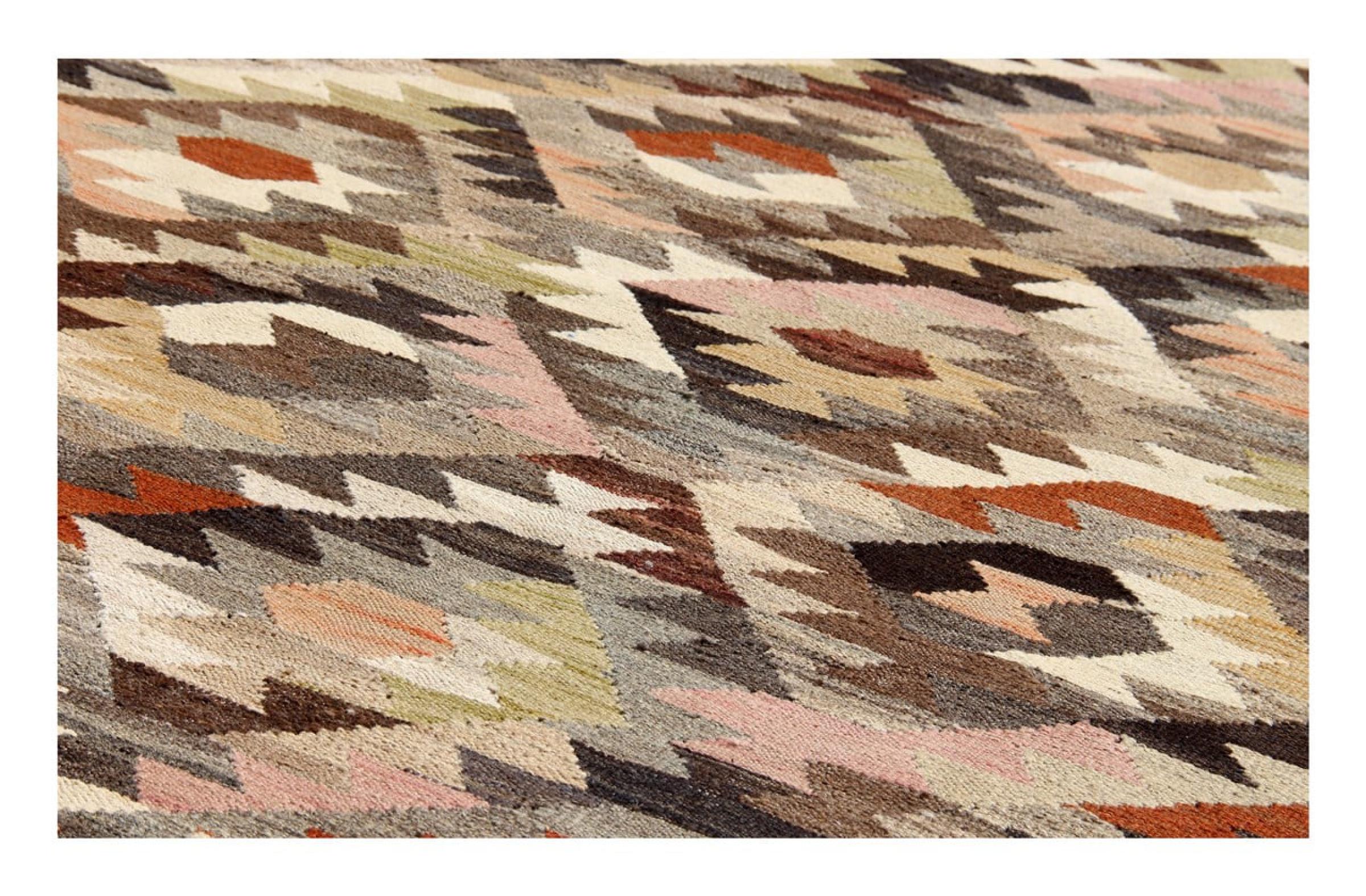 This rug was made as a flat weave by hand on a loom. Flatweave is the term used to describe rugs that have no pile. As the name promises, these rugs are woven and not knotted. This results in a flat rug with a structured surface. Flatweaves are not as soft and usually thinner than knotted rugs. At the same time they are much less complex to manufacture and can usually be laid out from both sides (front and back). Their patterns are usually geometric, which is determined by the fabric.