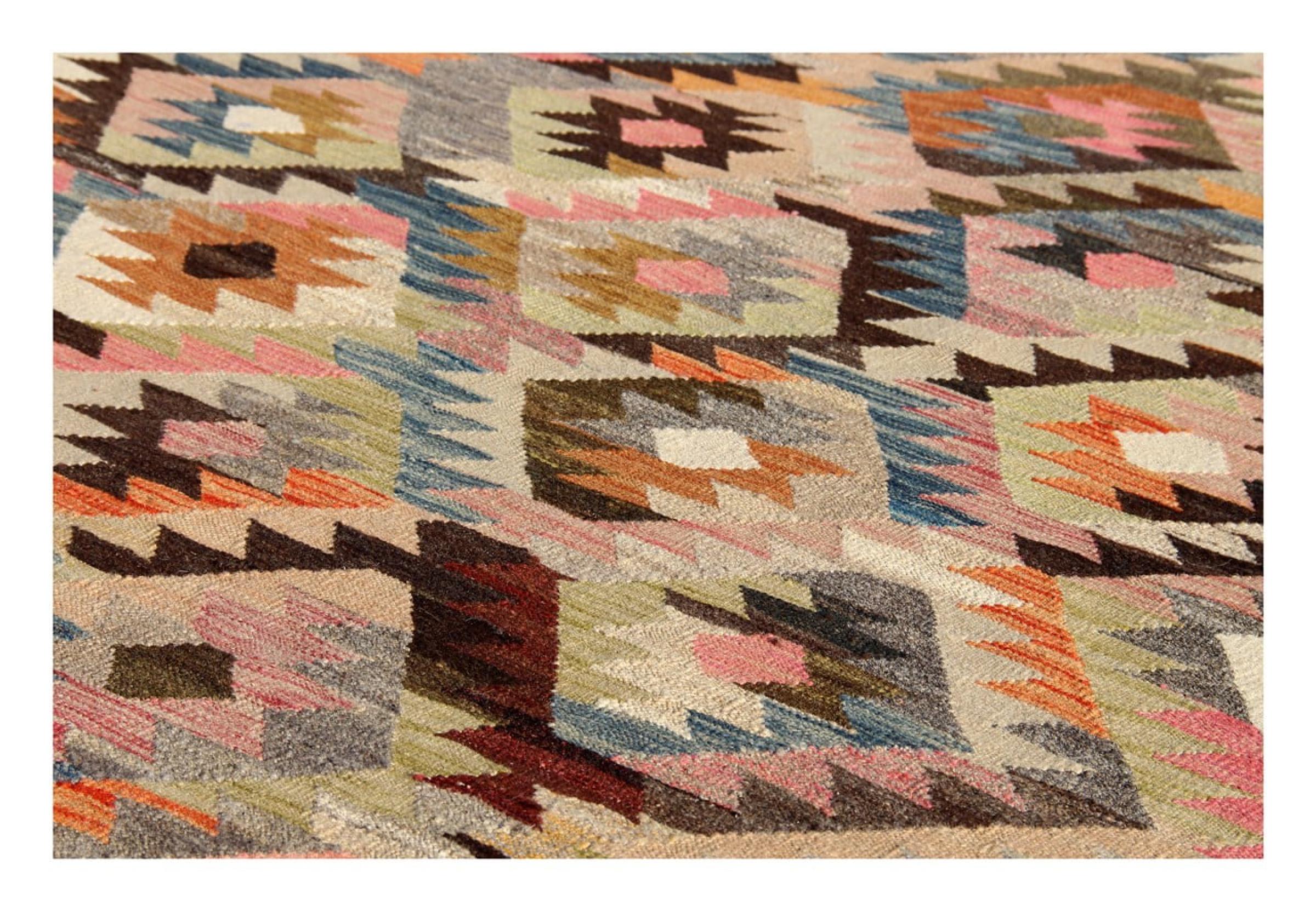 This rug was made as a flat weave by hand on a loom. Flatweave is the term used to describe rugs that have no pile. As the name promises, these rugs are woven and not knotted. This results in a flat rug with a structured surface. Flatweaves are not as soft and usually thinner than knotted rugs. At the same time they are much less complex to manufacture and can usually be laid out from both sides (front and back). Their patterns are usually geometric, which is determined by the fabric.