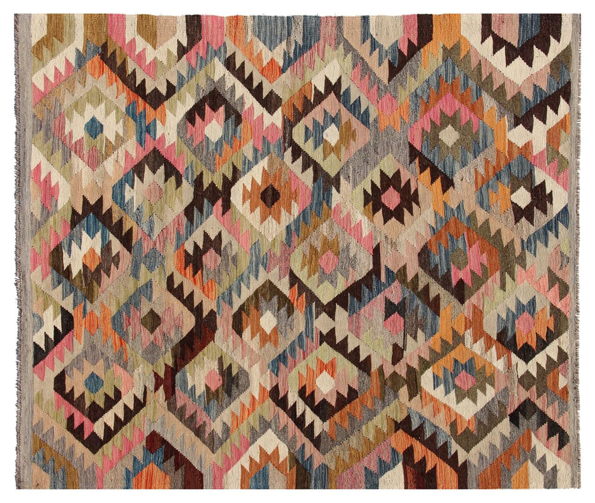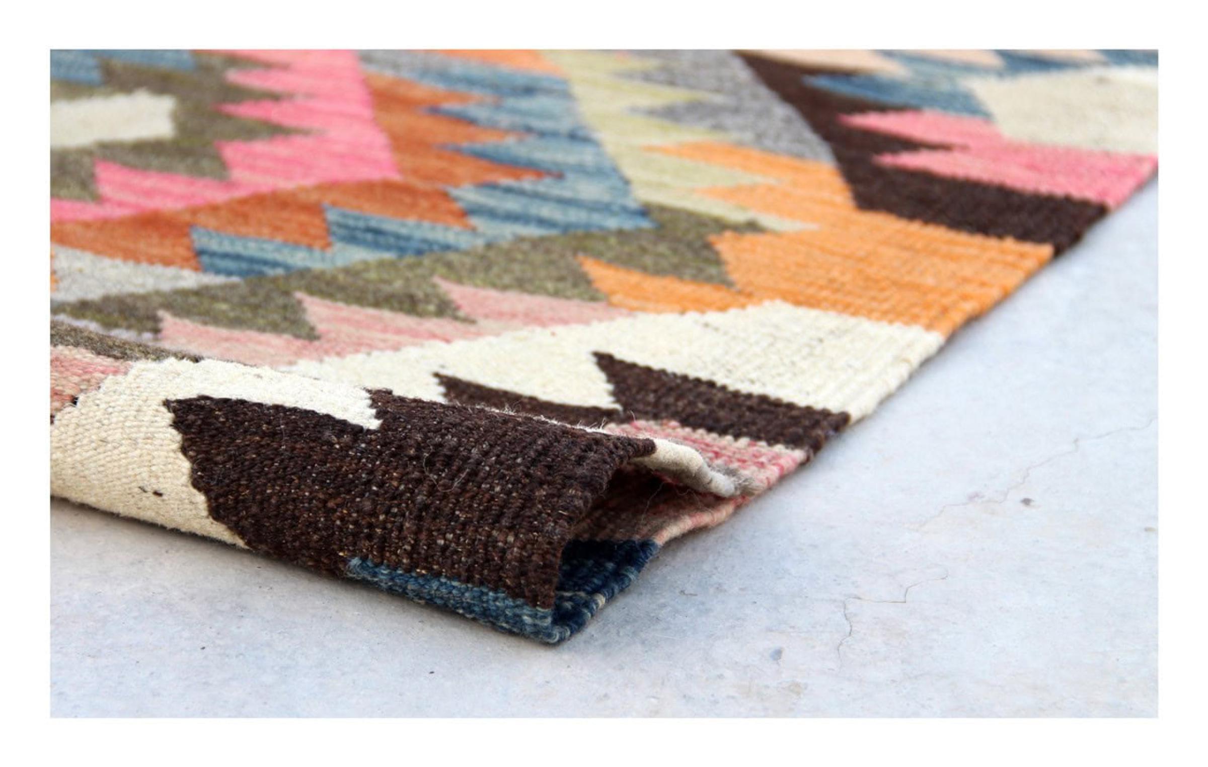 These Kilim rugs have a significant difference from hand-knotted rugs—they are handwoven. As a result, they do not have a high pile of wool and are often flatter and rougher than knotted wool rugs. Their construction is less intricate, making them generally much more affordable. Additionally, Kilim rugs are much lighter and can be laid out on either side. Handwoven Kilims originally come from what was once Persia and are now also widely produced in Afghanistan. They typically feature simple, straight-line patterns, which are characteristic of their weaving technique.
