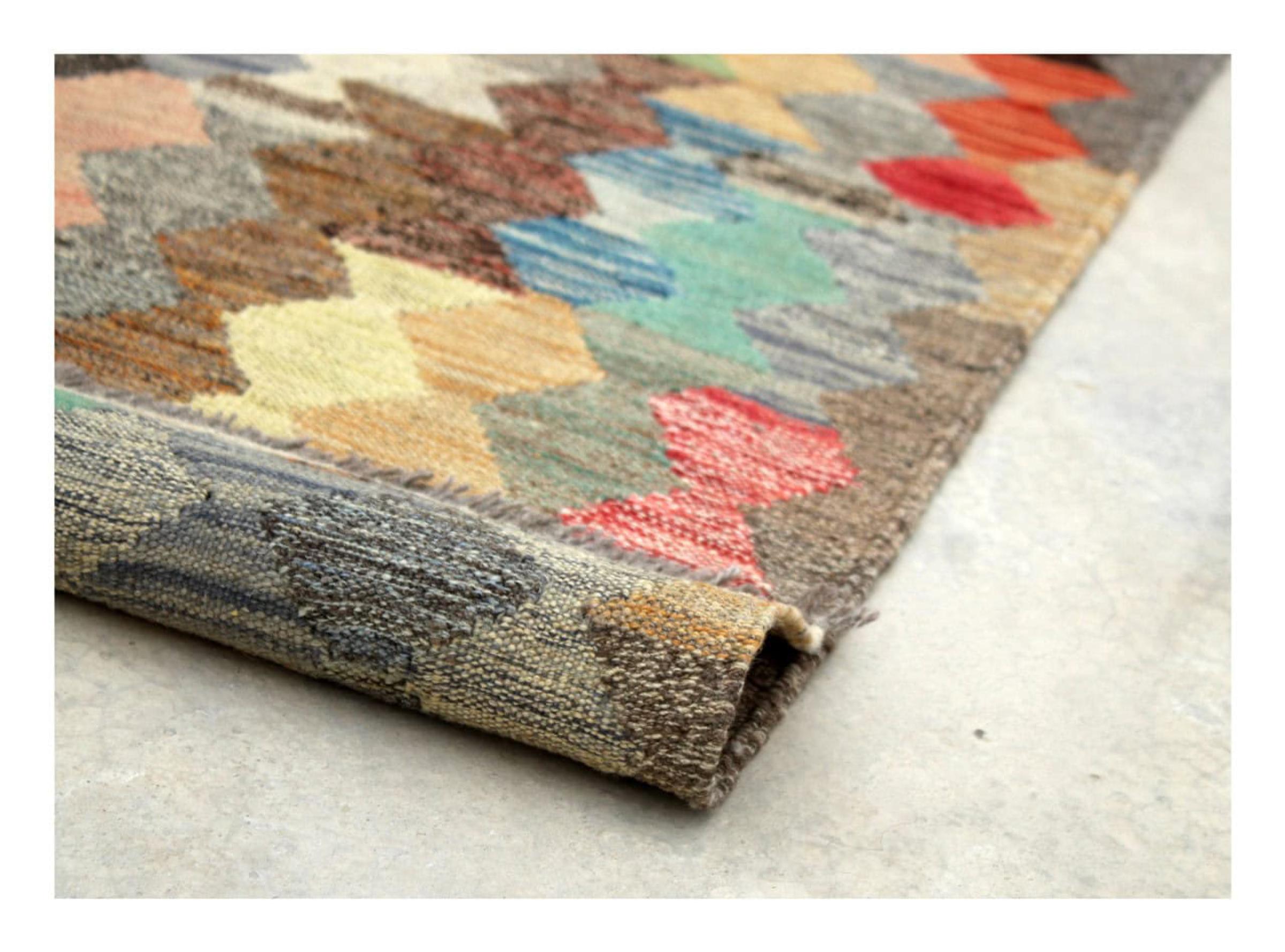 These Kilim rugs have a significant difference from hand-knotted rugs—they are handwoven. As a result, they do not have a high pile of wool and are often flatter and rougher than knotted wool rugs. Their construction is less intricate, making them generally much more affordable. Additionally, Kilim rugs are much lighter and can be laid out on either side. Handwoven Kilims originally come from what was once Persia and are now also widely produced in Afghanistan. They typically feature simple, straight-line patterns, which are characteristic of their weaving technique.