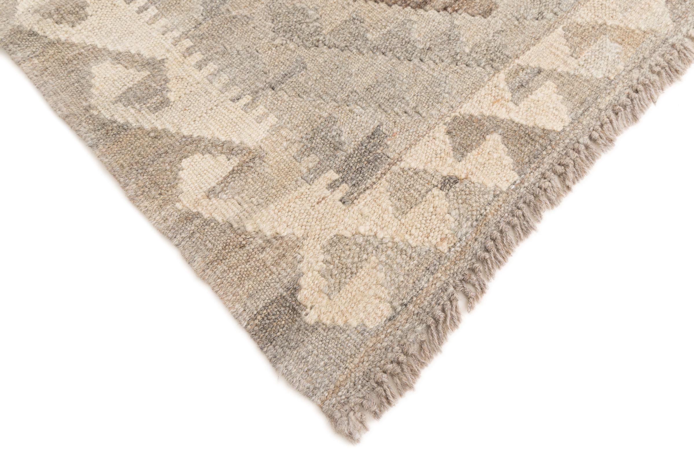 This rug was made as a flat weave by hand on a loom. Flatweave is the term used to describe rugs that have no pile. As the name promises, these rugs are woven and not knotted. This results in a flat rug with a structured surface. Flatweaves are not as soft and usually thinner than knotted rugs. At the same time they are much less complex to manufacture and can usually be laid out from both sides (front and back). Their patterns are usually geometric, which is determined by the fabric.