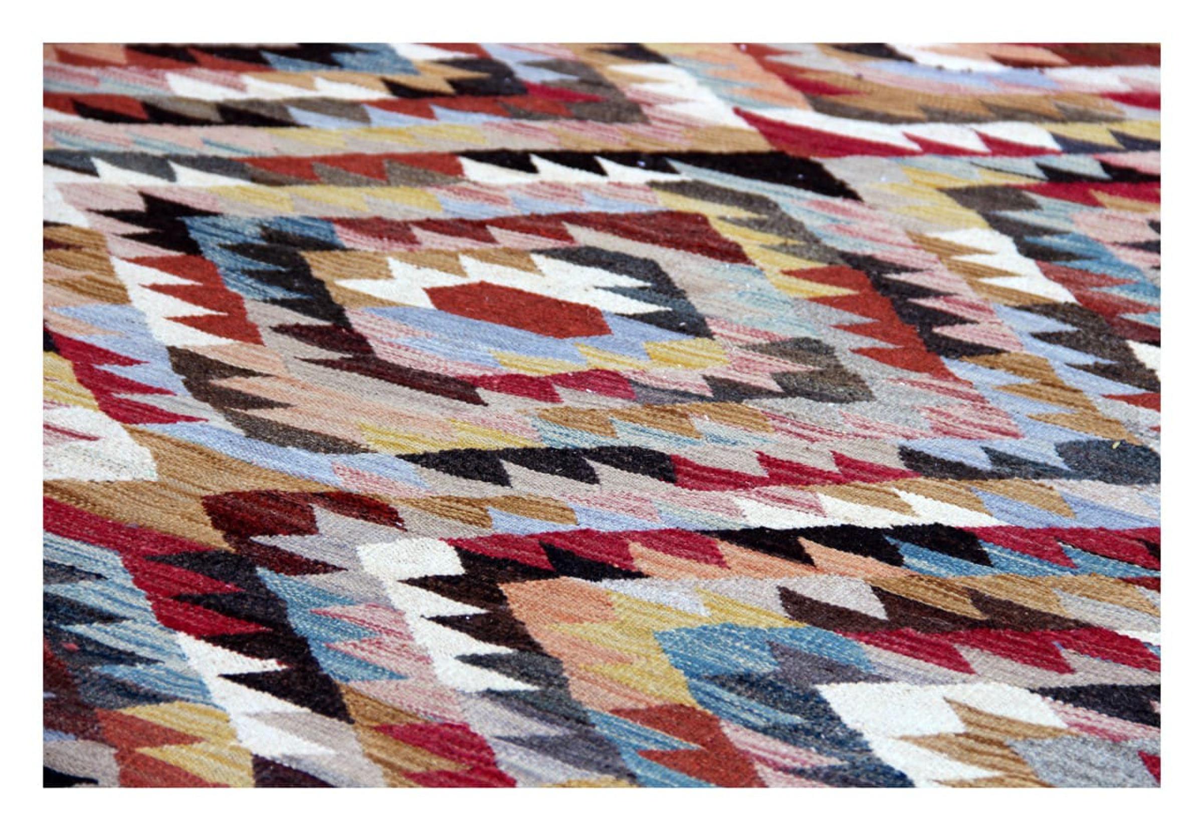 These Kilim rugs have a significant difference from hand-knotted rugs—they are handwoven. As a result, they do not have a high pile of wool and are often flatter and rougher than knotted wool rugs. Their construction is less intricate, making them generally much more affordable. Additionally, Kilim rugs are much lighter and can be laid out on either side. Handwoven Kilims originally come from what was once Persia and are now also widely produced in Afghanistan. They typically feature simple, straight-line patterns, which are characteristic of their weaving technique.