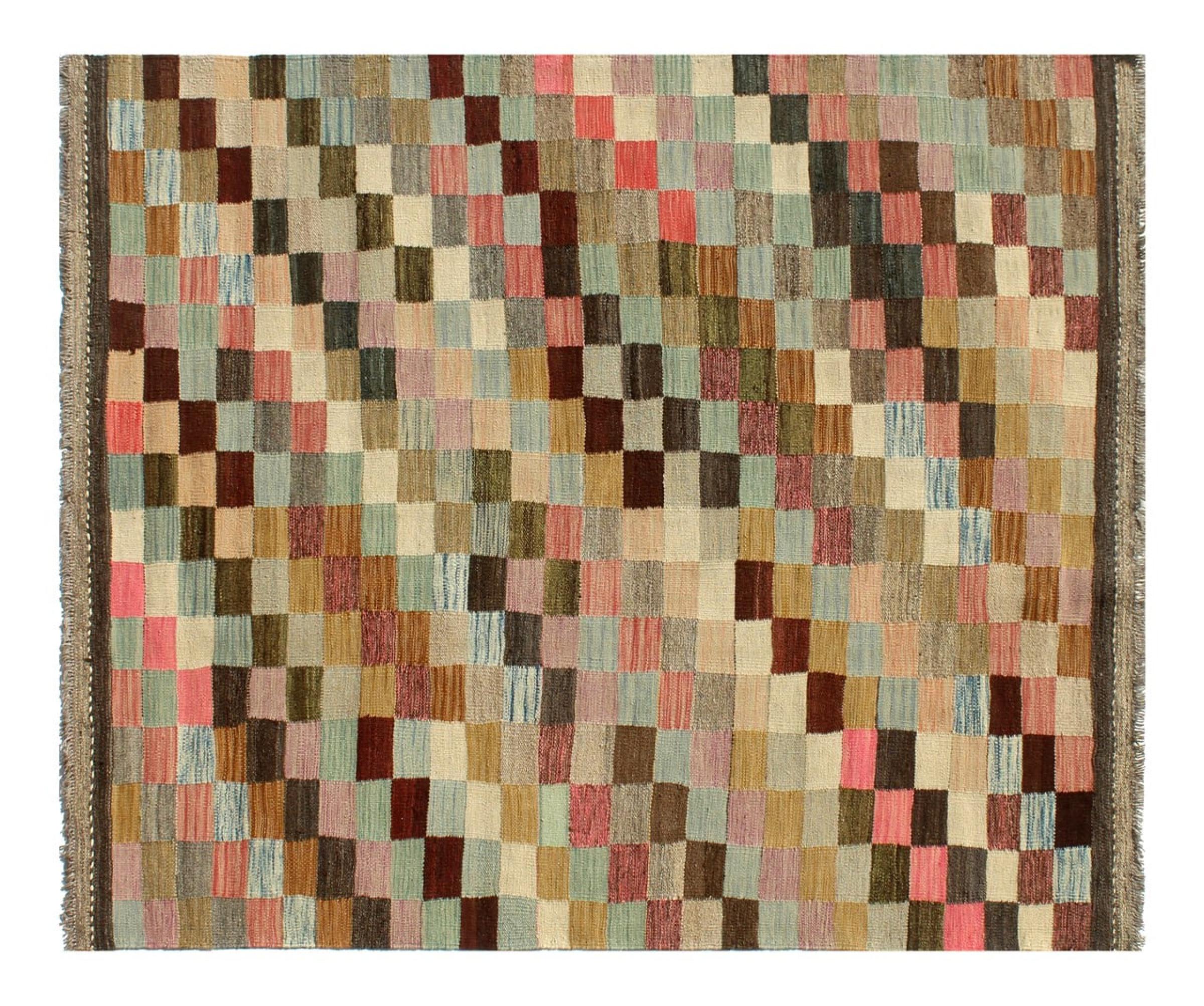 This rug was made as a flat weave by hand on a loom. Flatweave is the term used to describe rugs that have no pile. As the name promises, these rugs are woven and not knotted. This results in a flat rug with a structured surface. Flatweaves are not as soft and usually thinner than knotted rugs. At the same time they are much less complex to manufacture and can usually be laid out from both sides (front and back). Their patterns are usually geometric, which is determined by the fabric.